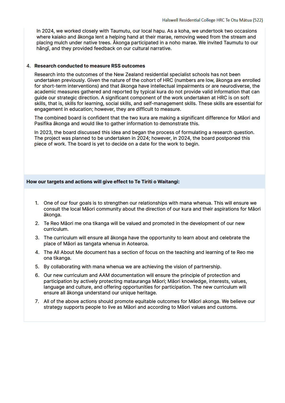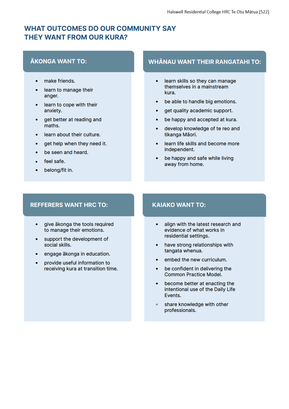 invited to participate in the consultation were current whānau, iwi, HRC kaiako, the NZEI union, and the PSA union.