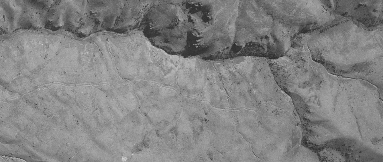 The wide road cutting into the natural hillside, and formed with culverts and revetments, is visible in a 1958 aerial