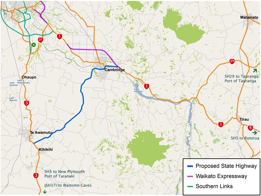 state highway between Cambridge and Te Awamutu in July 2014. The proposed new state highway