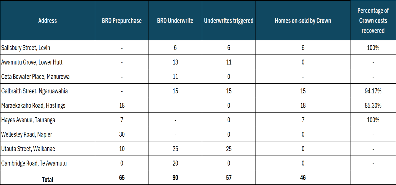 1. How many of the homes that have been bought by the Crown as a result of underwrites
