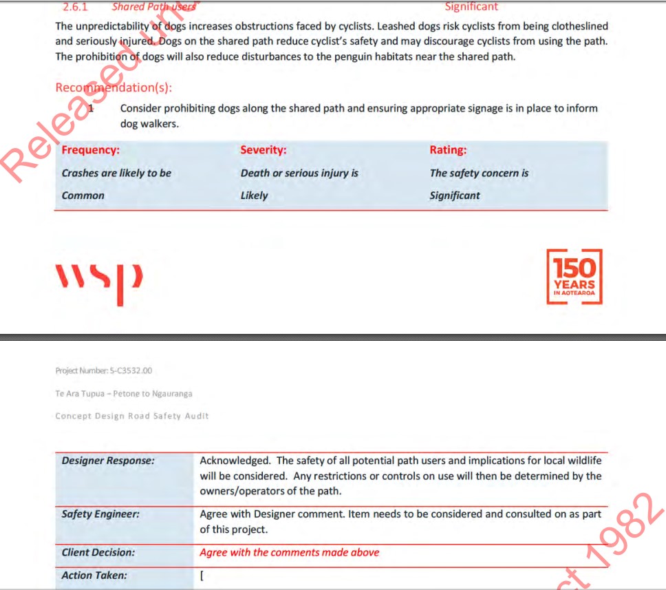 In July 2021, a preliminary concept design road safety audit was completed by WSP which noted safety risks posed by the dogs on the shared path (refer aƩached