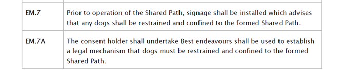 Following resource consent condiƟons were issued by the panel with respect to the dog control on the new shared path.