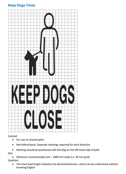 o Implement some of NZTA ‘keep dogs close’ markings (LINK HERE see below snip) on the path