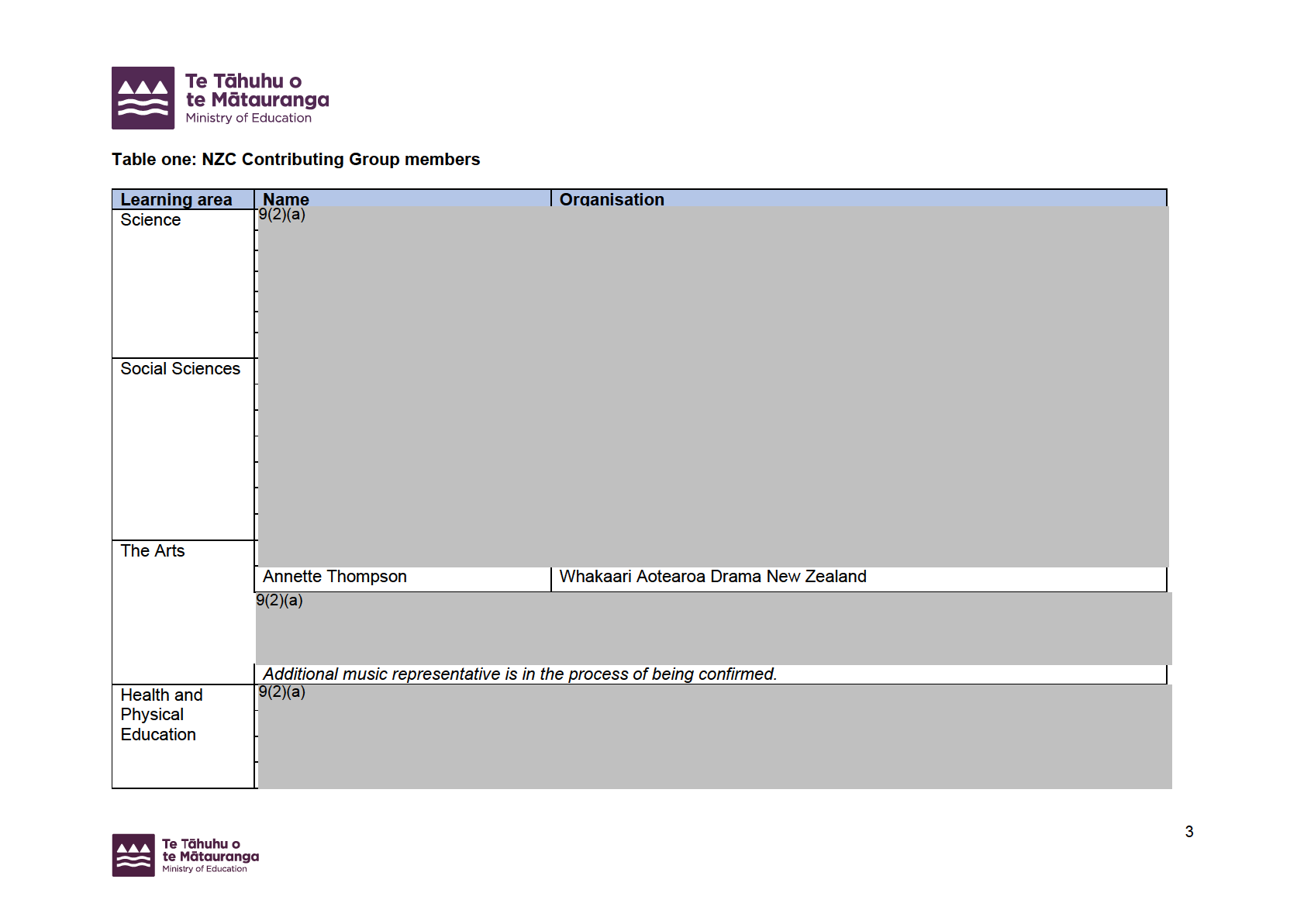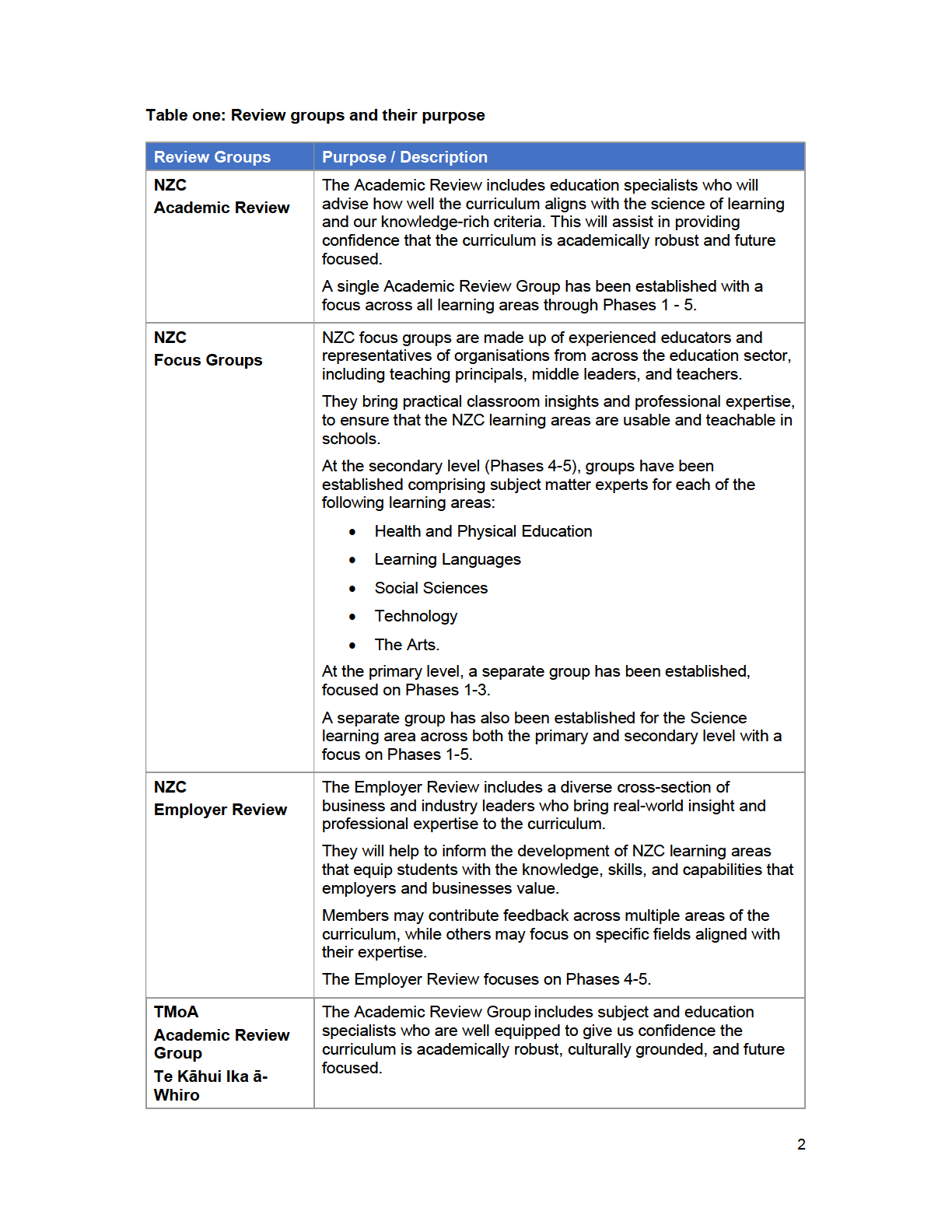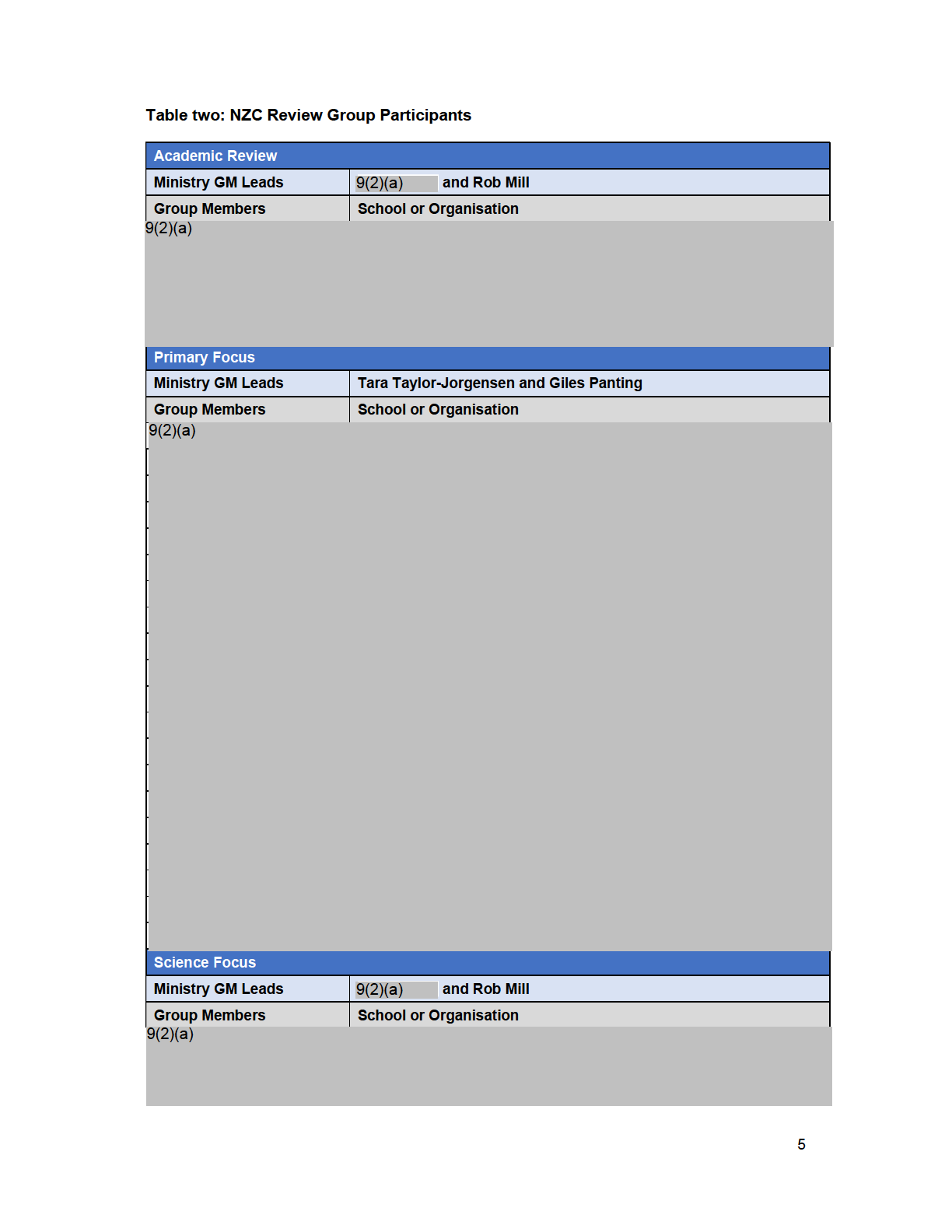 Participants for each of the review groups are listed in table two for the NZC and table three