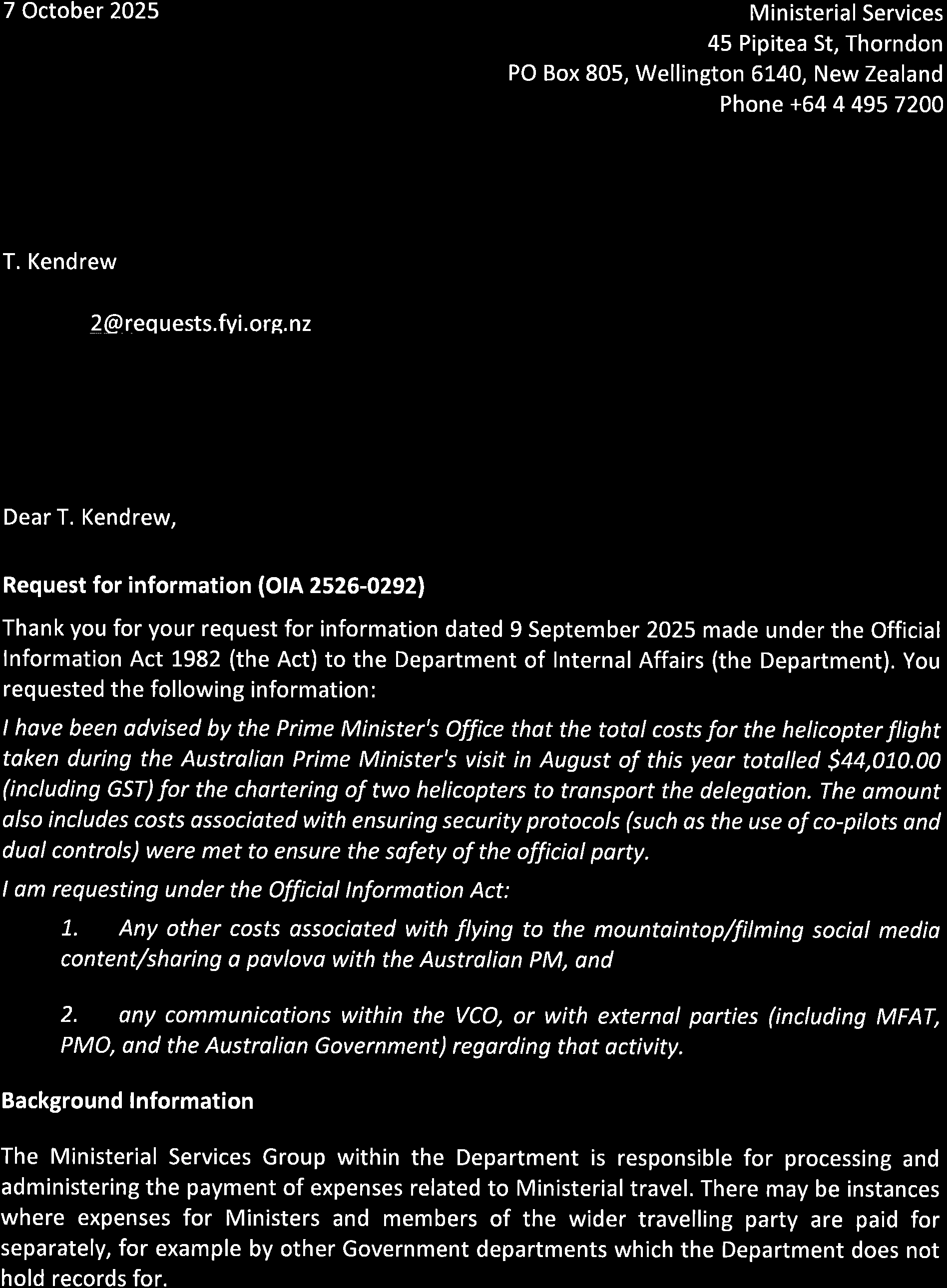 Department did not organise or pay for any catering including the pavlova. As such, I am