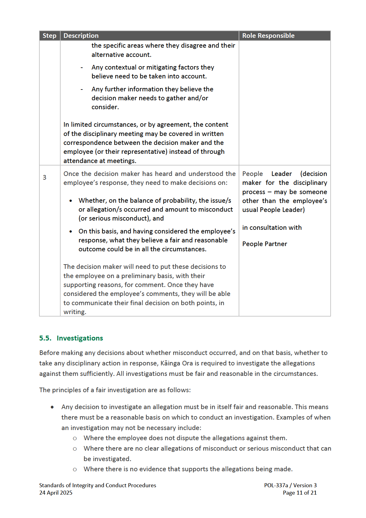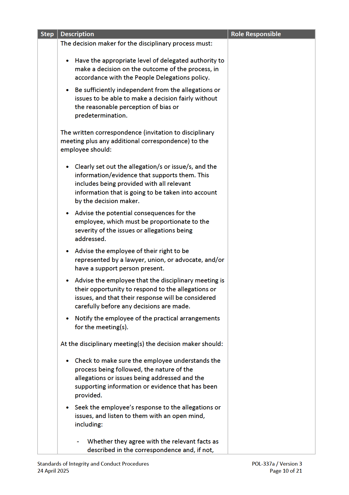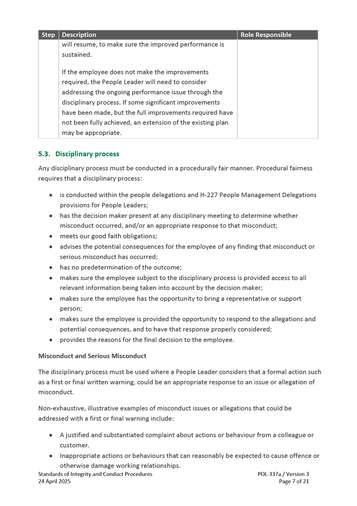 7.  Having considered the employee’s explanation/response, what is your preliminary view on a) whether misconduct occurred, and b) on that basis,