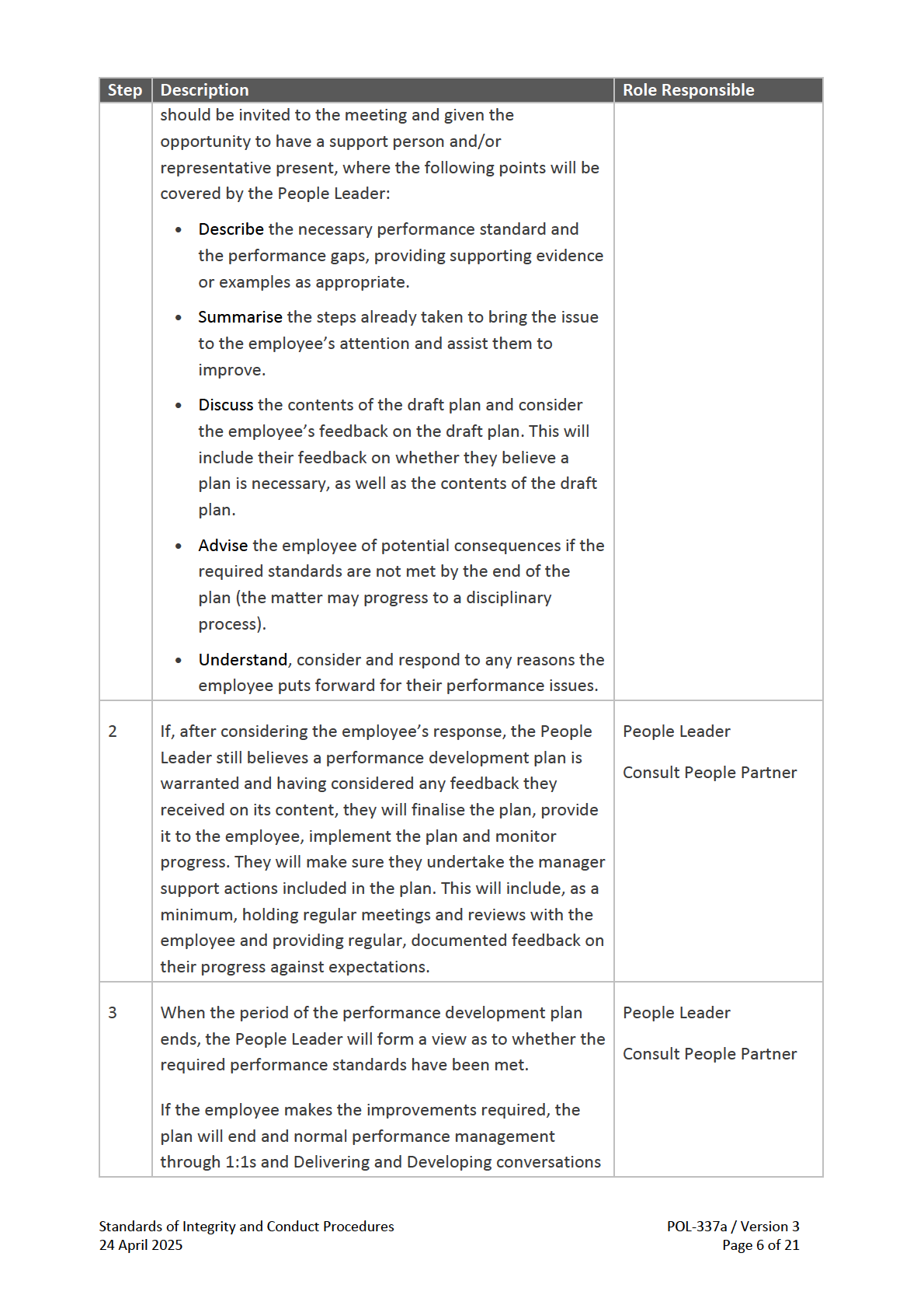 process, to address concerns about performance, behaviour, conduct or integrity, or where they