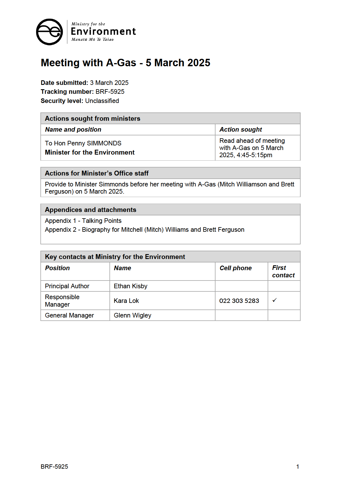 2. A-Gas is meeting with Officials on 6 March 2025 following your meeting. A-Gas has