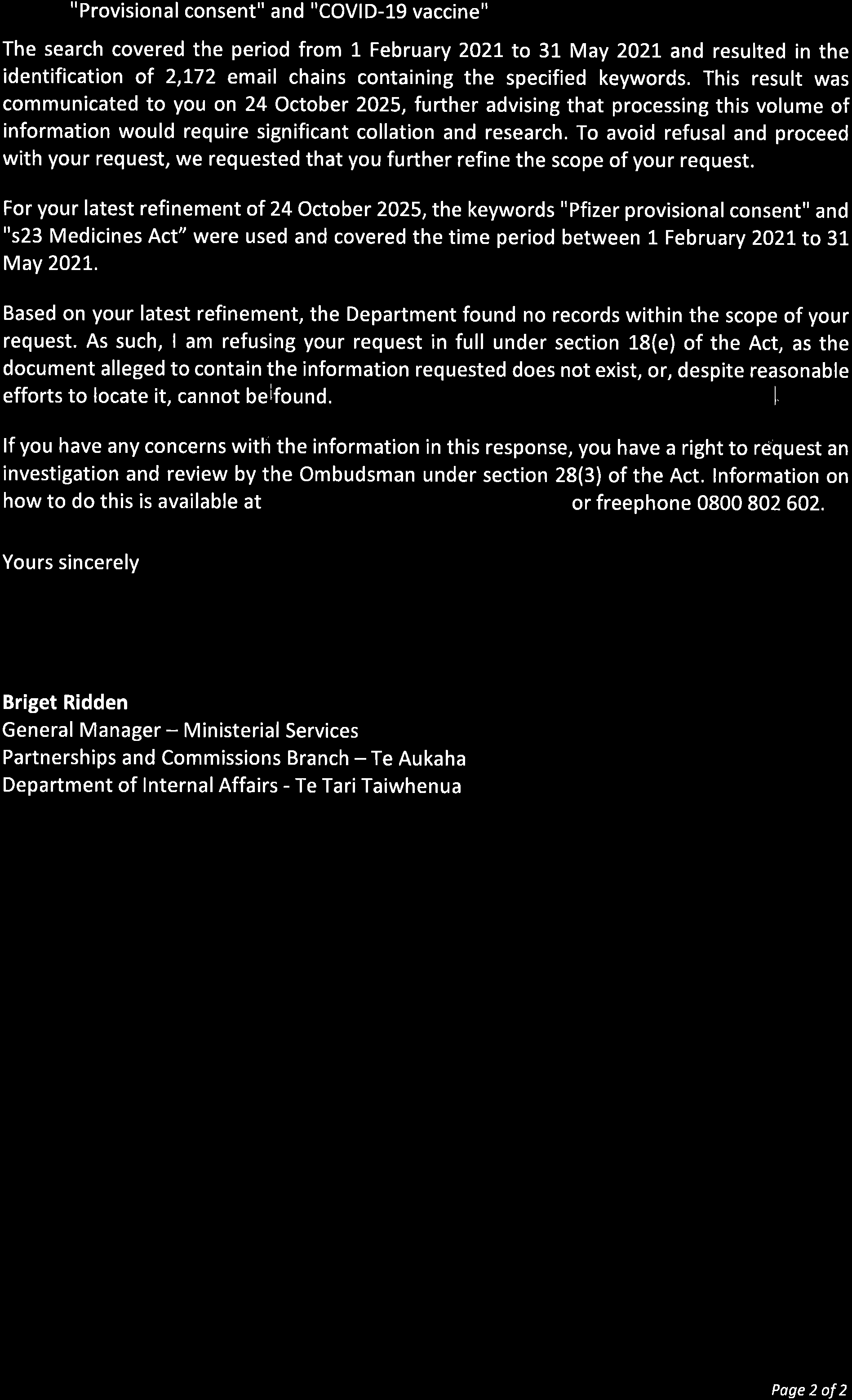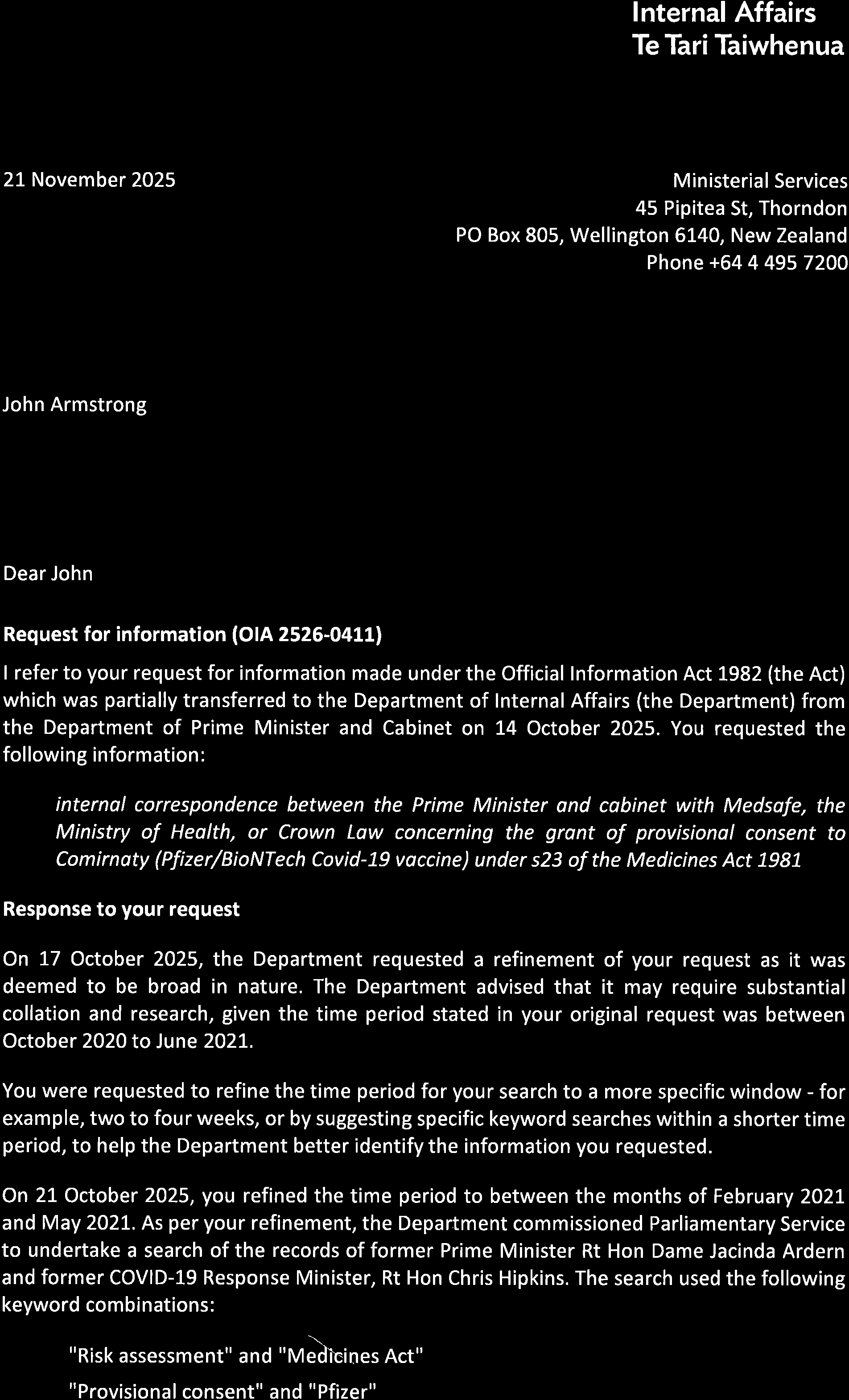 Legal advice and Cabinet papers regarding Pfizer/Comirnaty provisional consent and Medicines Amendment Act 2021