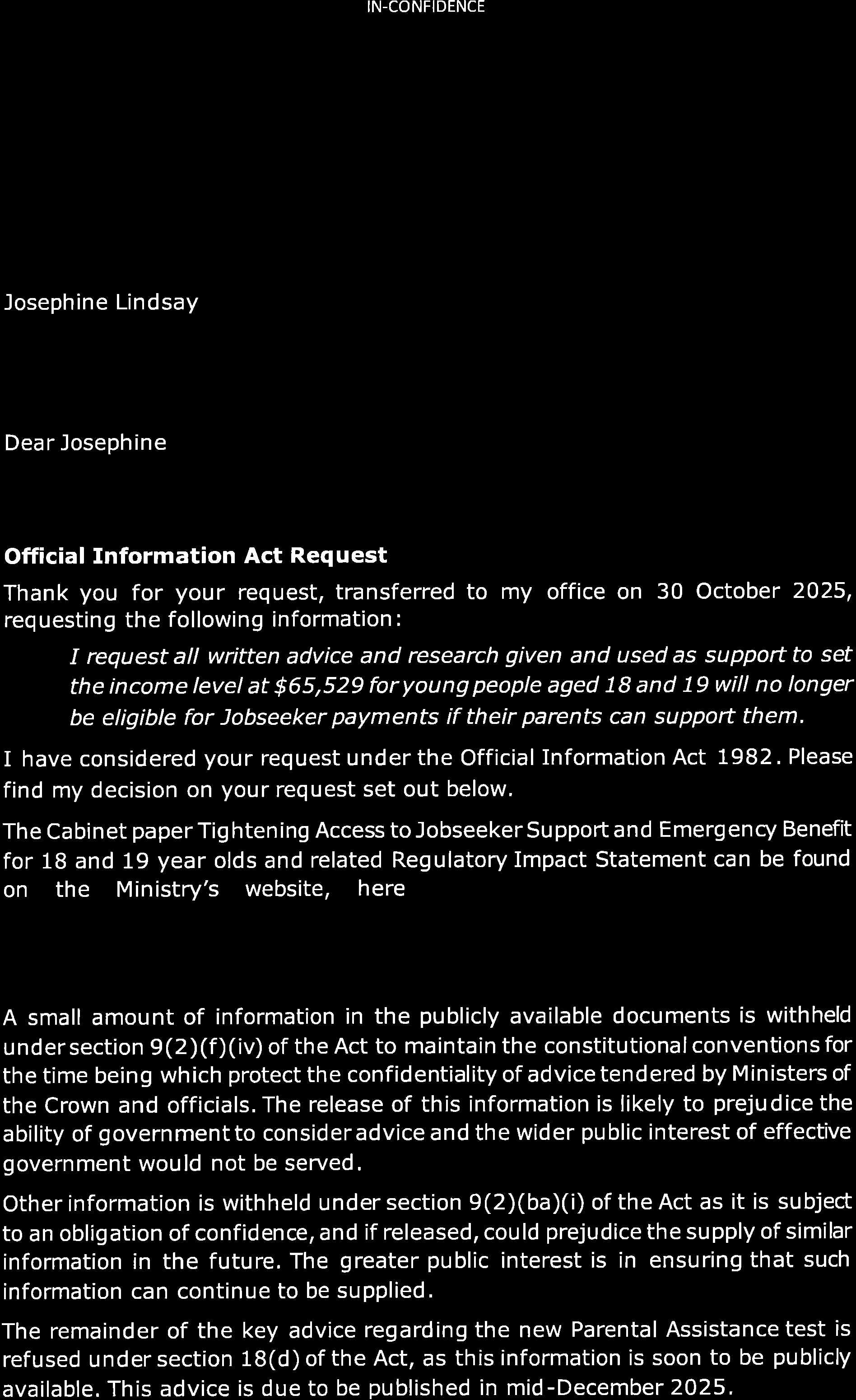 Advice given for setting income limit for young people aged 18 and 19 will no longer be eligible for Jobseeker payments if their parents can support them