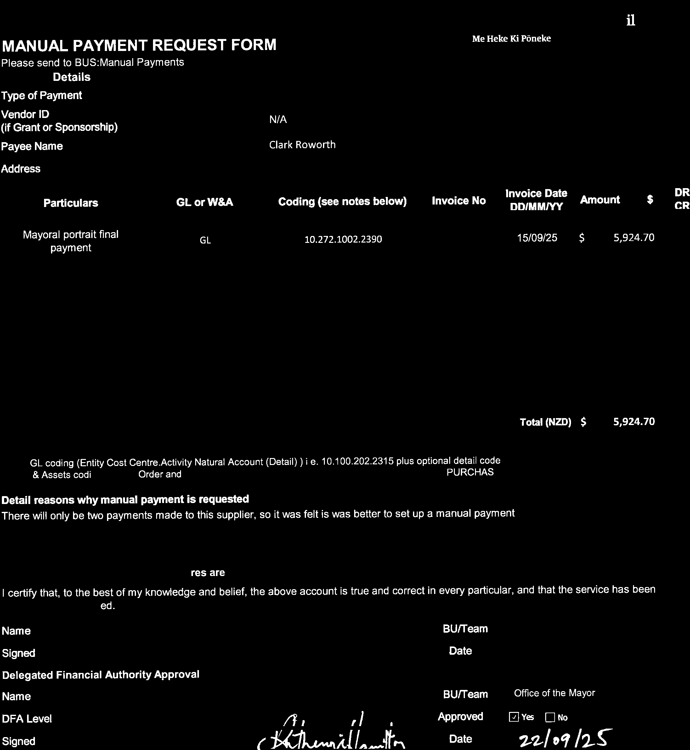 Subject: Manual payment for Clark Roworth