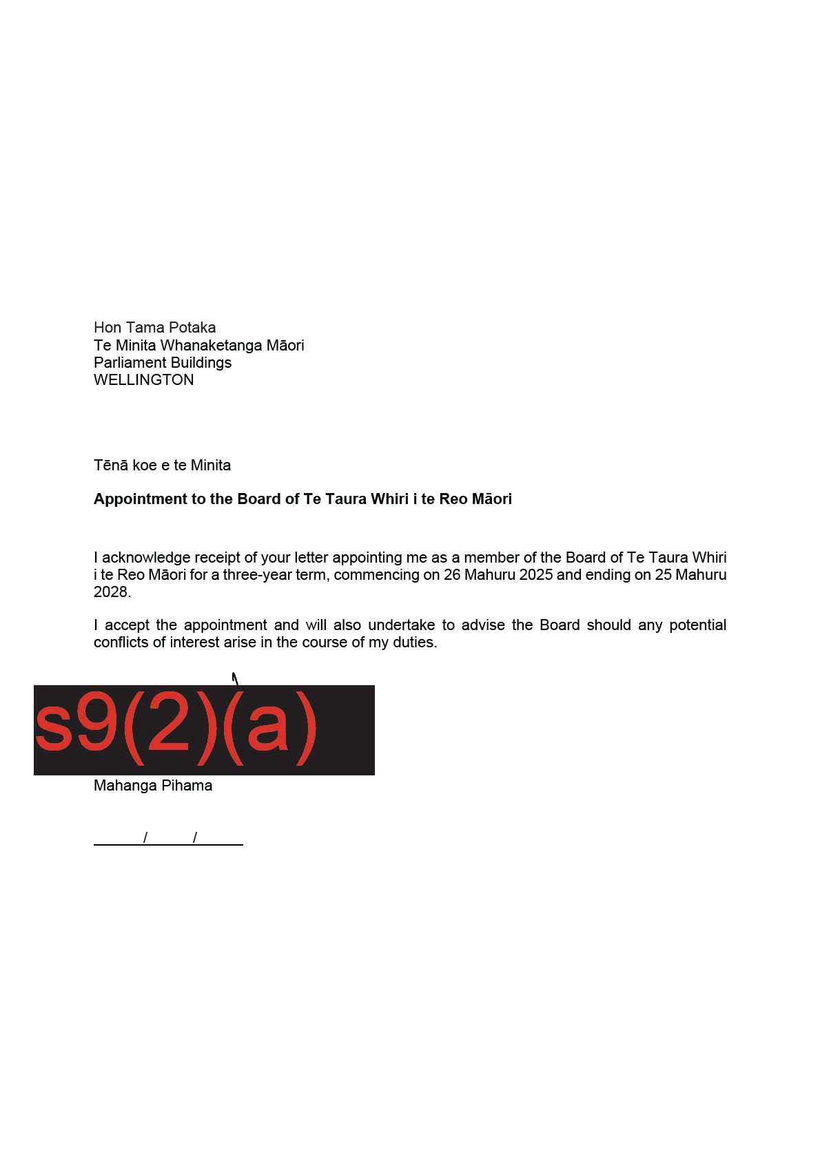 I am pleased to confirm your appointment as a member to the Board of Te Taura Whiri i te Reo