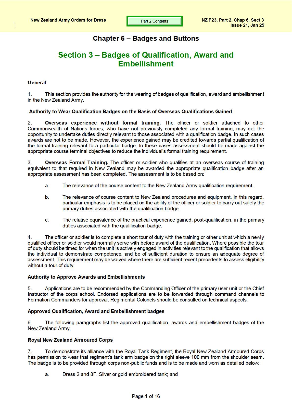 leaves. The badge is to be worn by soldiers and officers who have completed the RNZMP senior investigator’s