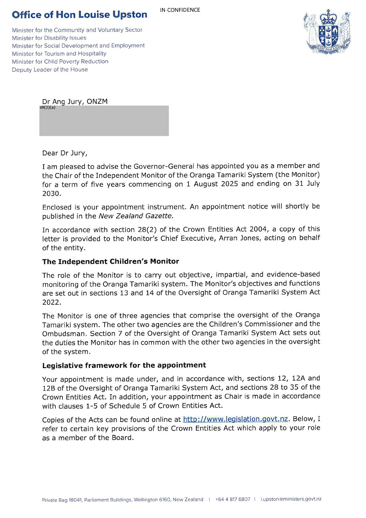 Appointment to the Independent Monitor of the Oranga Tamariki System (the Monitor)