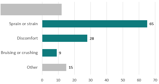 Sprain or strain continues to be the highest injury type making up 53% of our reported incidents. The majority of these are related to poor ergonomic set up which should be addressed.
