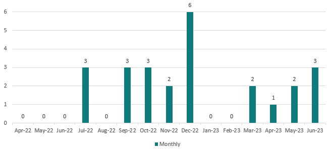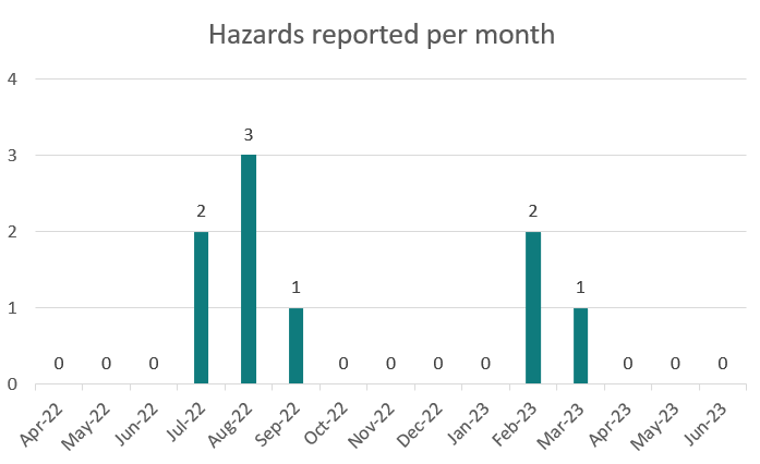 No hazards reported this quarter. However, this is not an indication that no hazards are occurring – there is low reporting on hazards, this is something that should be addressed through education and promotion