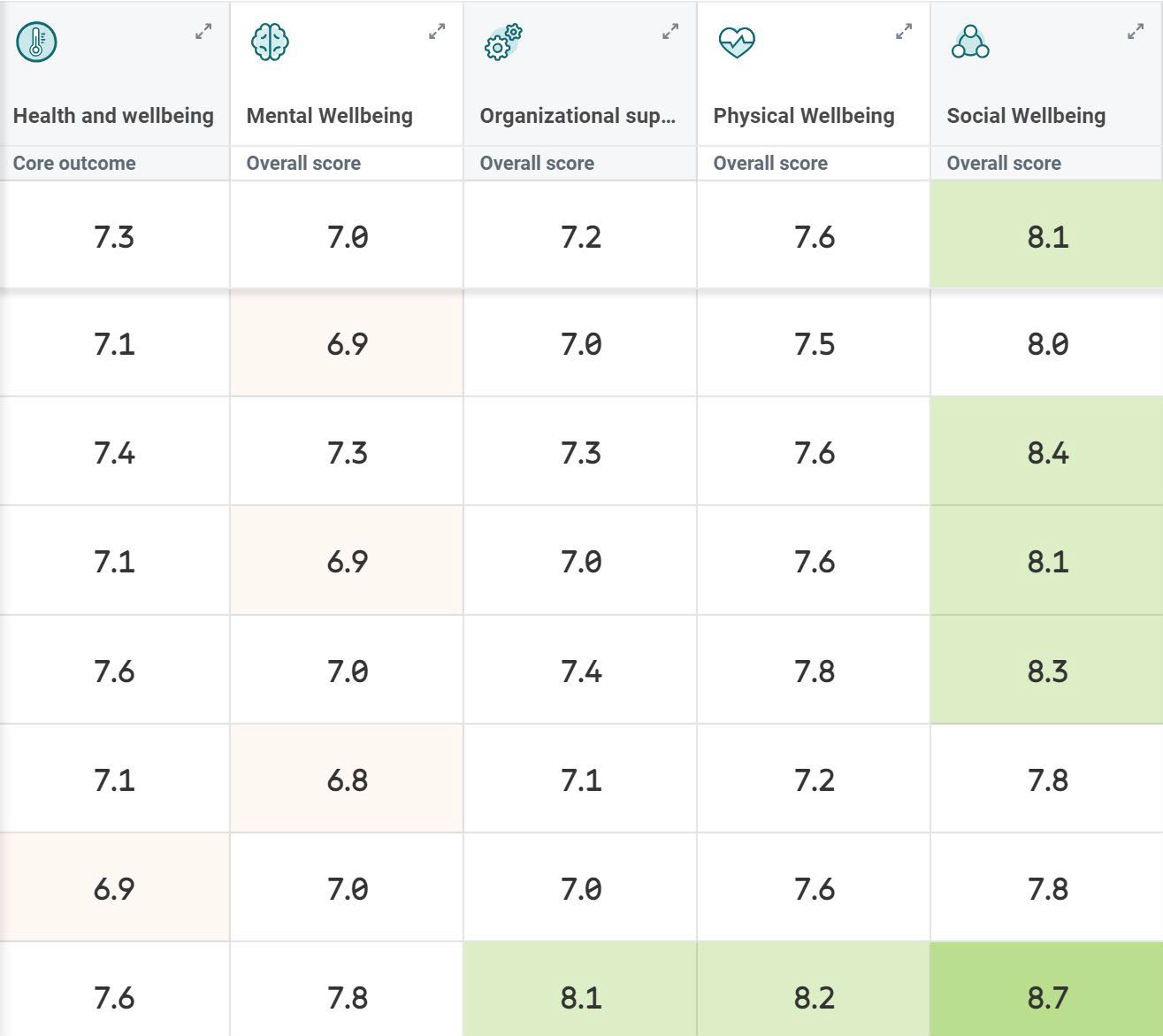 Wellbeing (+0.7), and Social Wellbeing (+0.1).