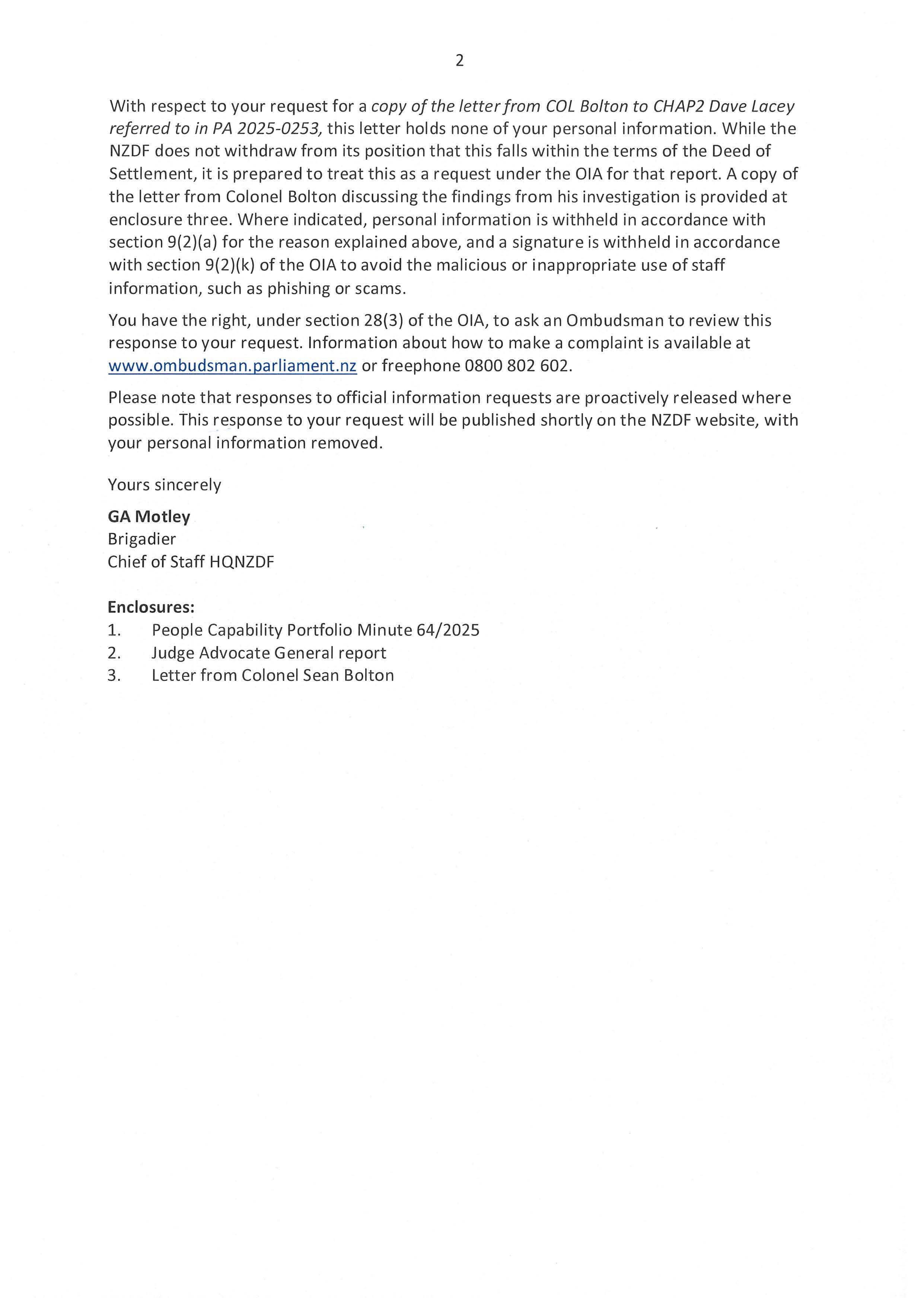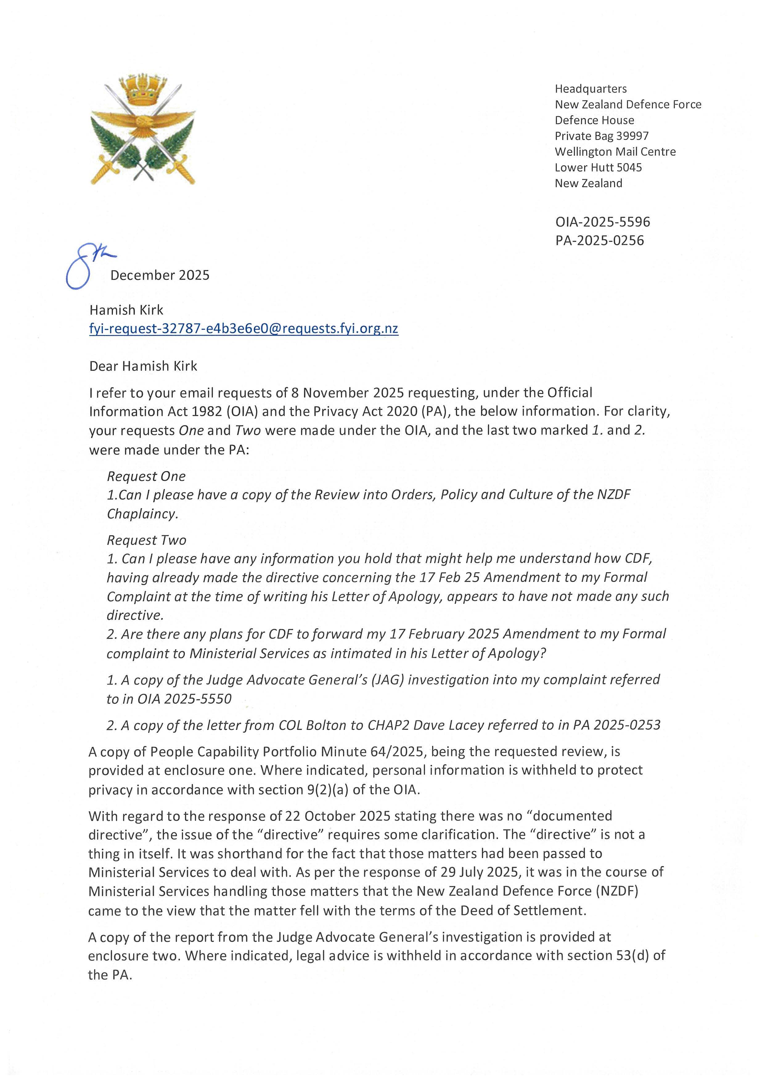 Review of NZDF Chaplaincy Orders, Policy and Culture, and a missing investigation