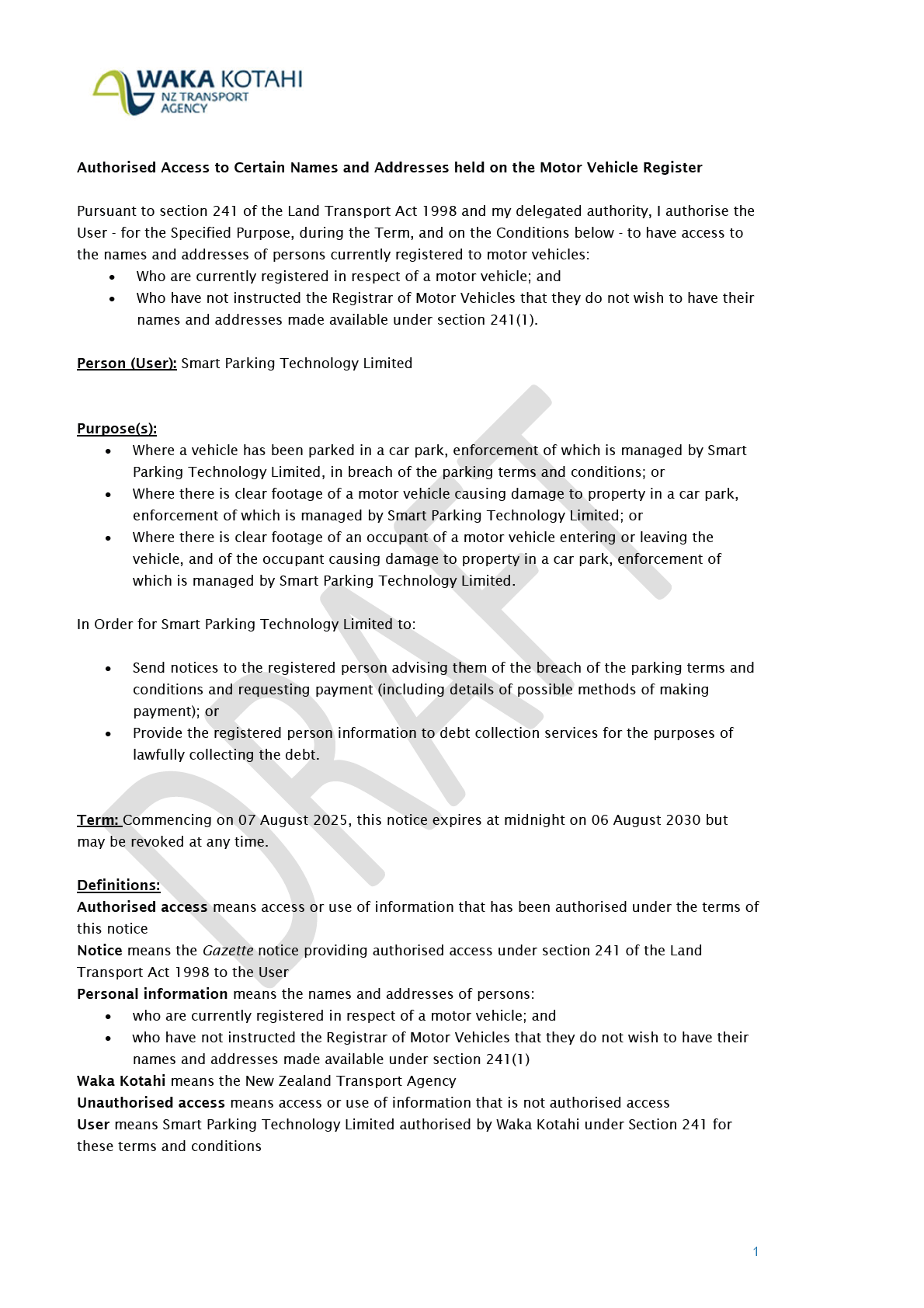 Land Transport Act 1998. The draft purposes, terms and conditions are attached to this letter. Please note, this is