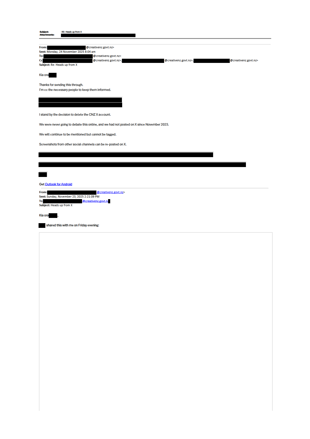 4. The exact date the Creative NZ X account was deleted and al communications if any,