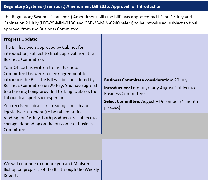 4. The Ministry’s view is that this will support the Minister of Transport to return to Cabinet later this