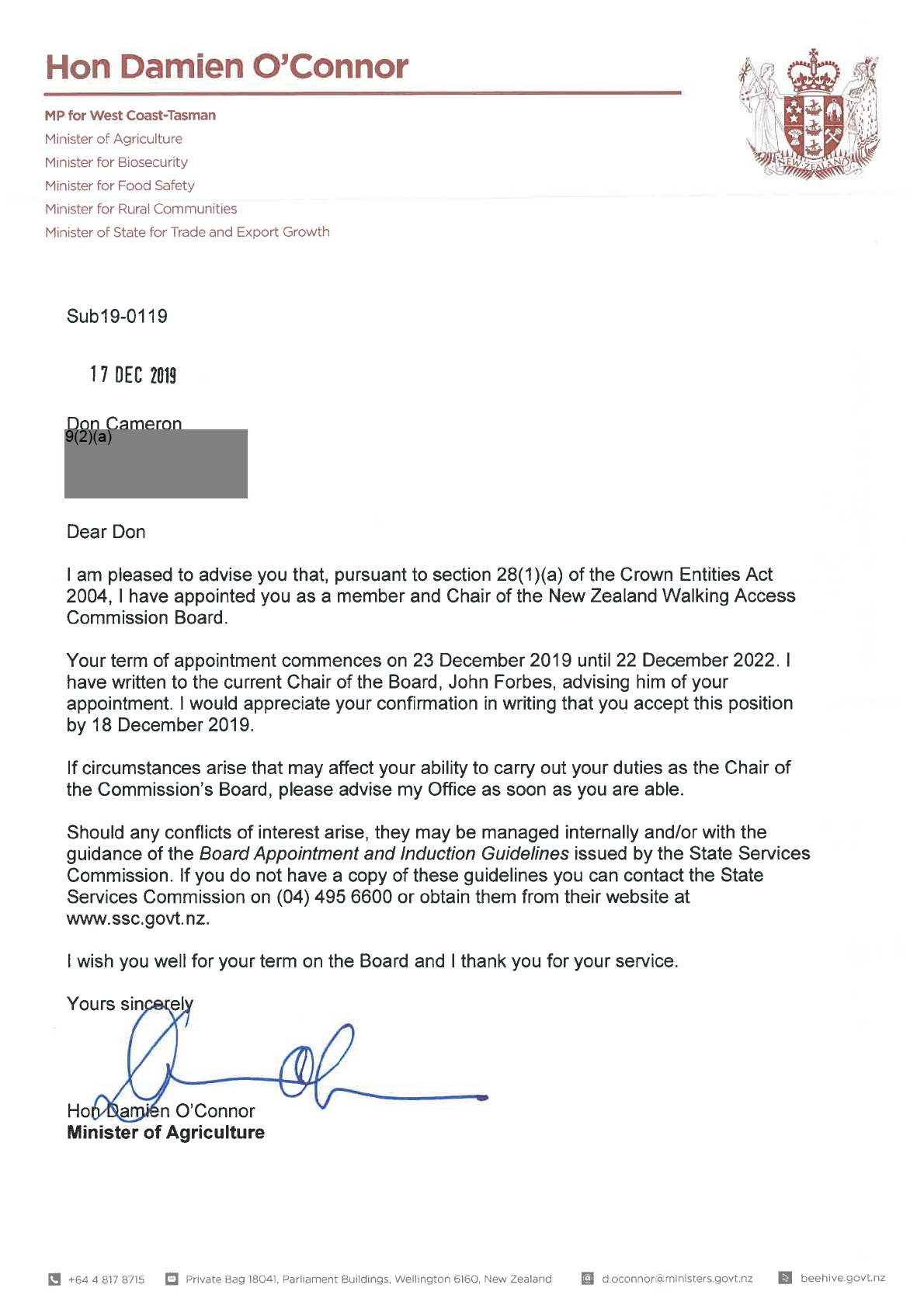 I am pleased to advise you that, pursuant to section 28(1)(a) of the Crown Entities Act 2004