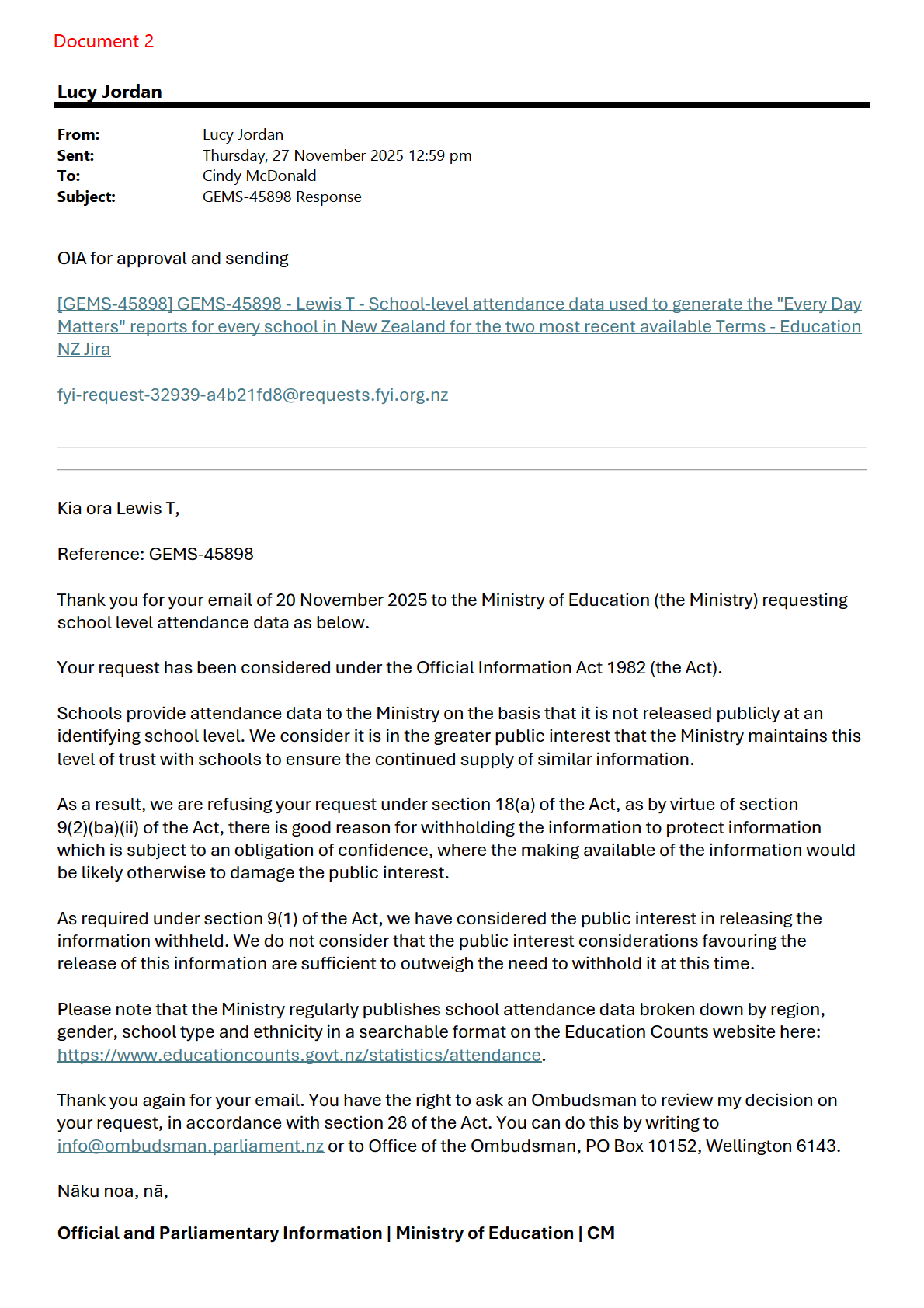 Thank you for your email of 20 November 2025 to the Ministry of Education (the Ministry) requesting