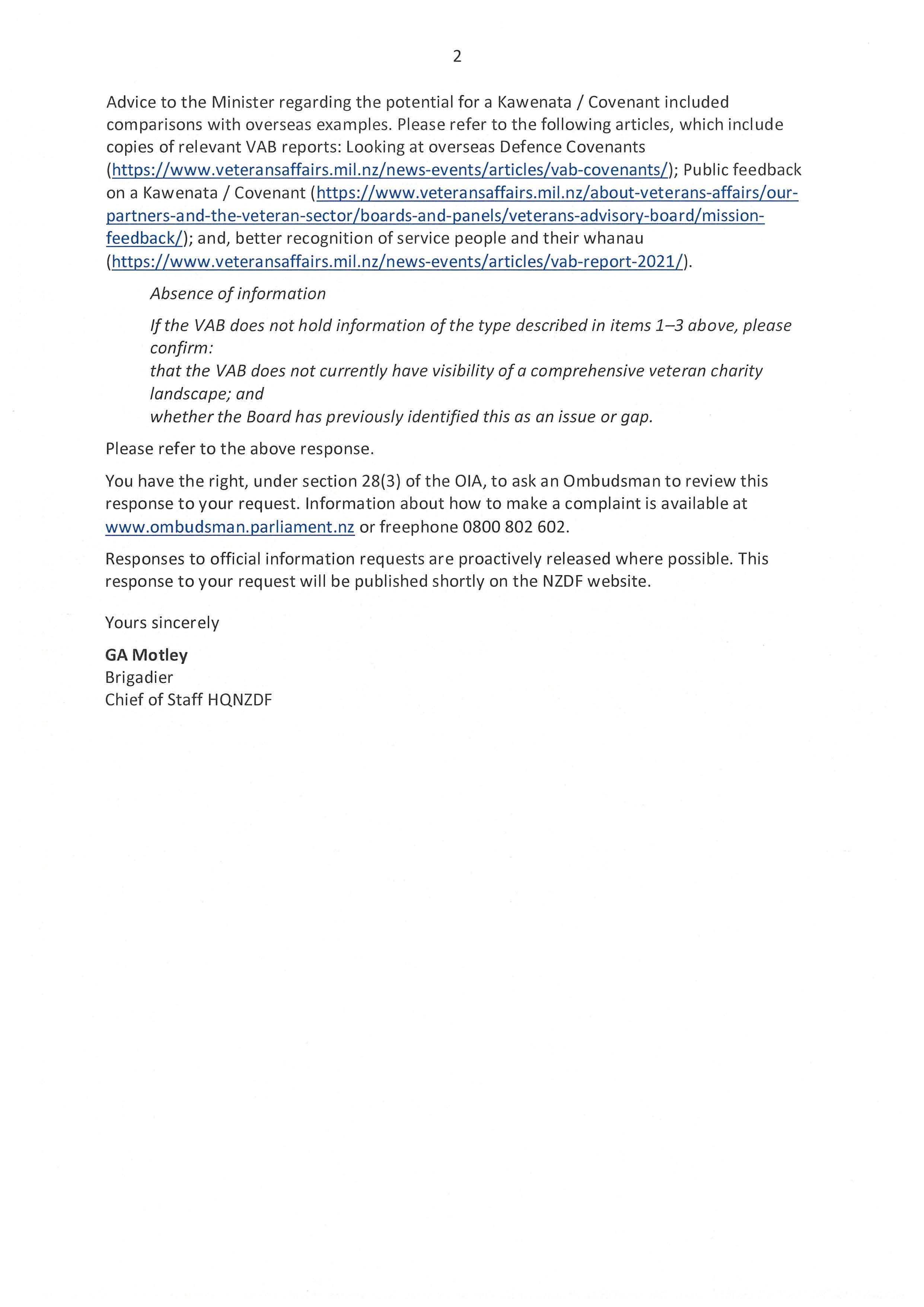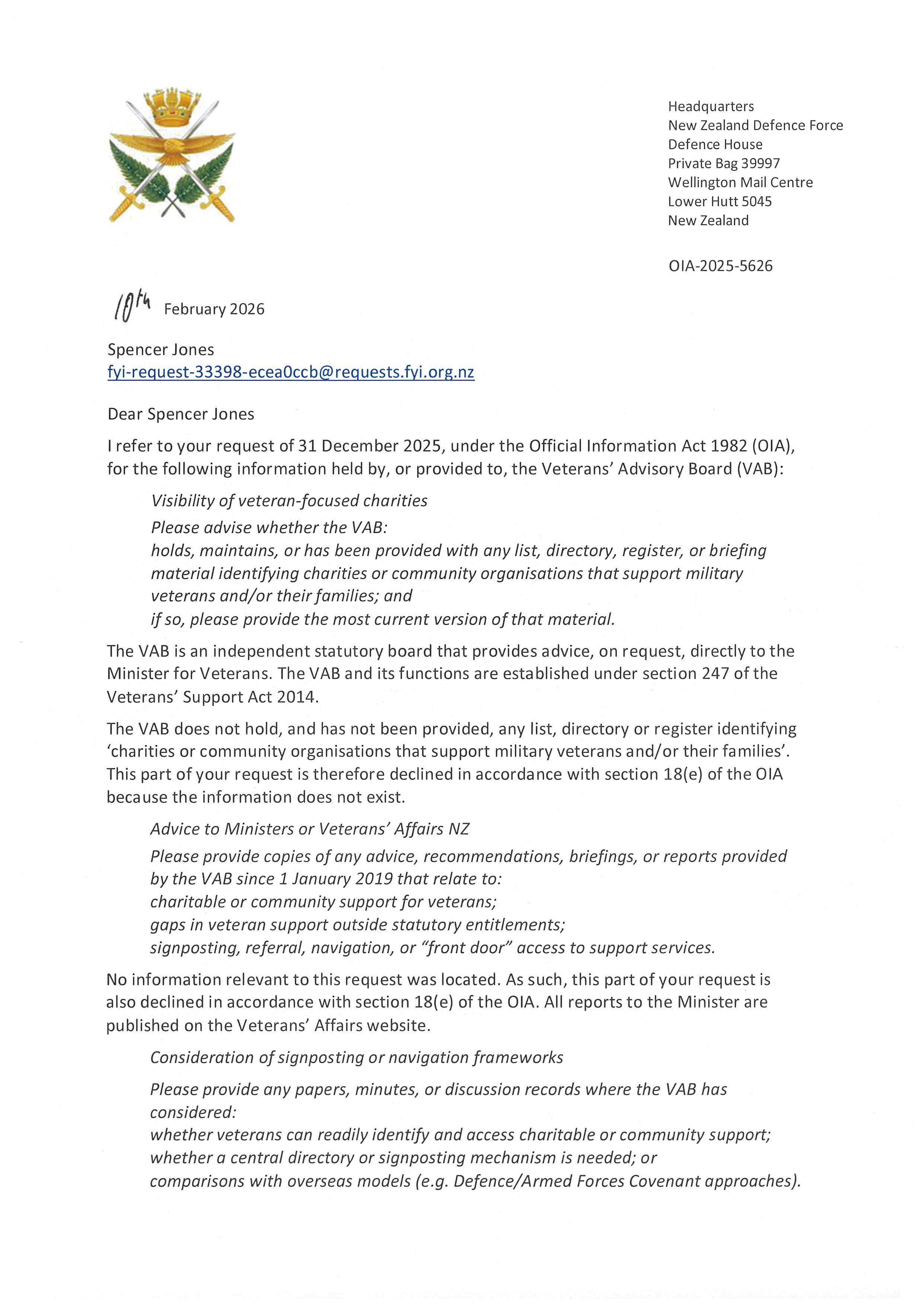 Request for information on Veterans Advisory Board visibility of veteran charities and advice on signposting and support gaps