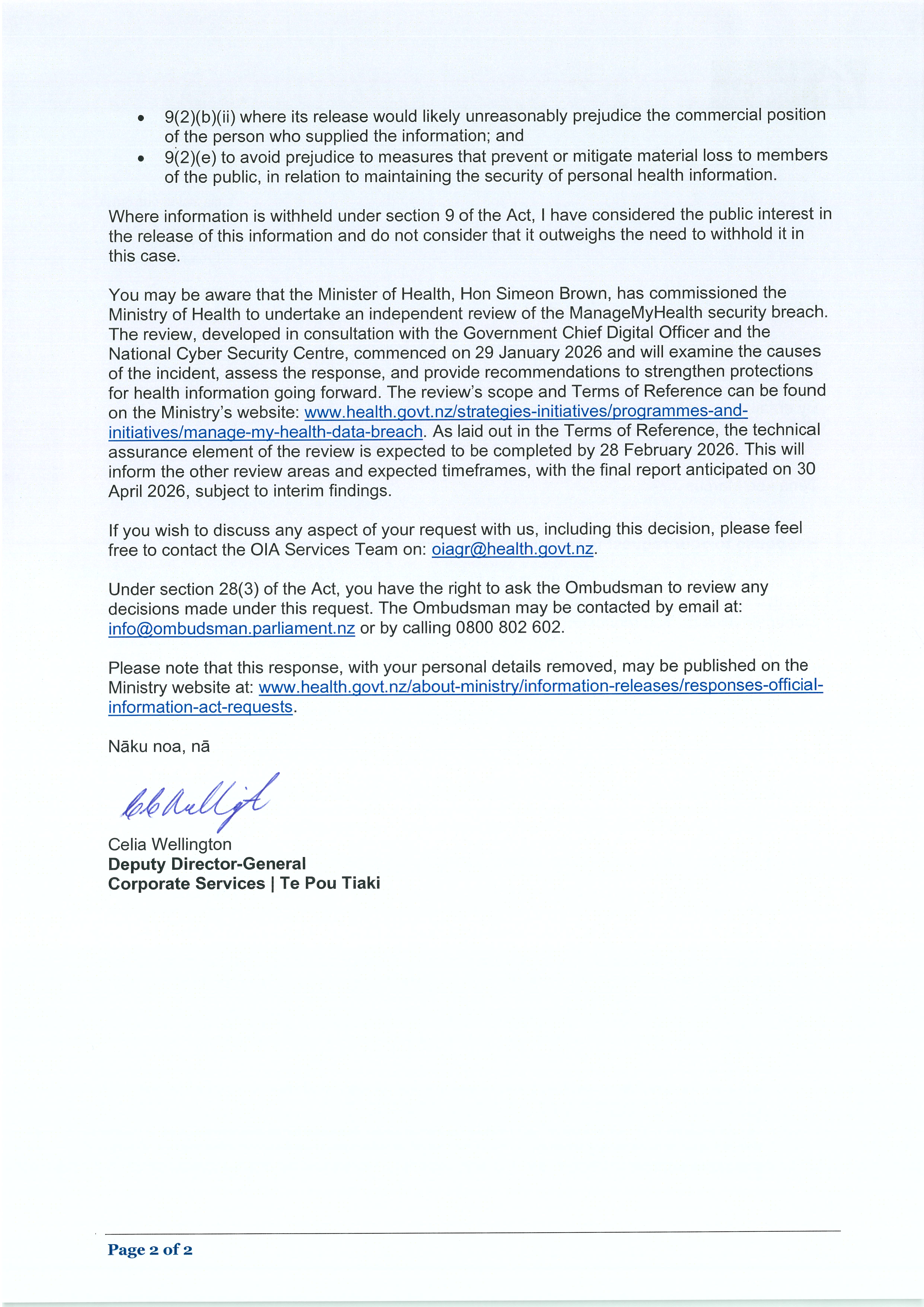 Health - Manato Hauora (the Ministry) on 2 January 2025 for information regarding