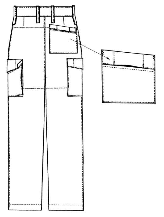 Slanted side pockets, hip pocket with button cover, thigh bellows pockets with button closure and