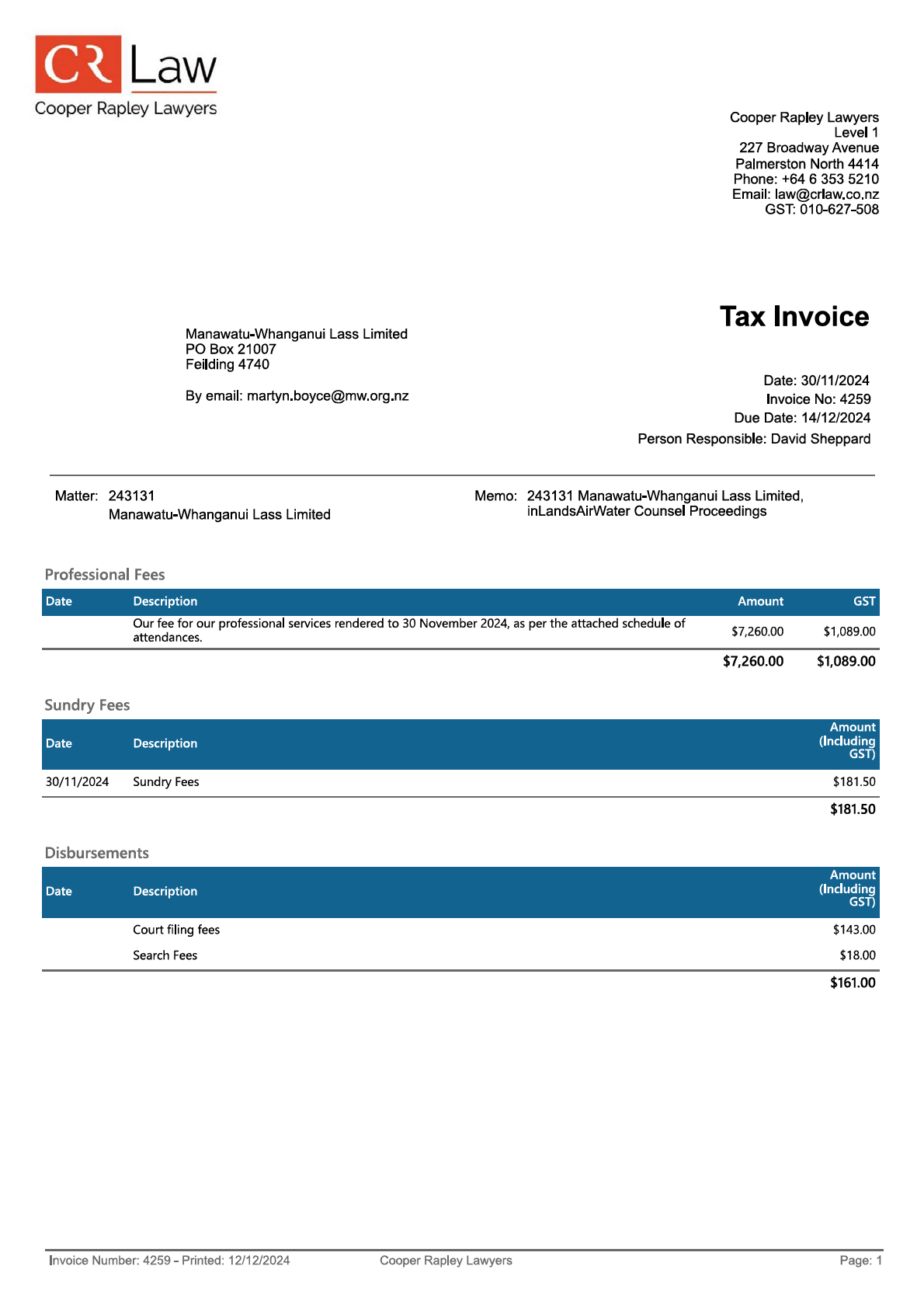 costs incurred in Civil case MWLASS vs inLandsAirWater CIV-2024-454-74 [2025] NZHC 351