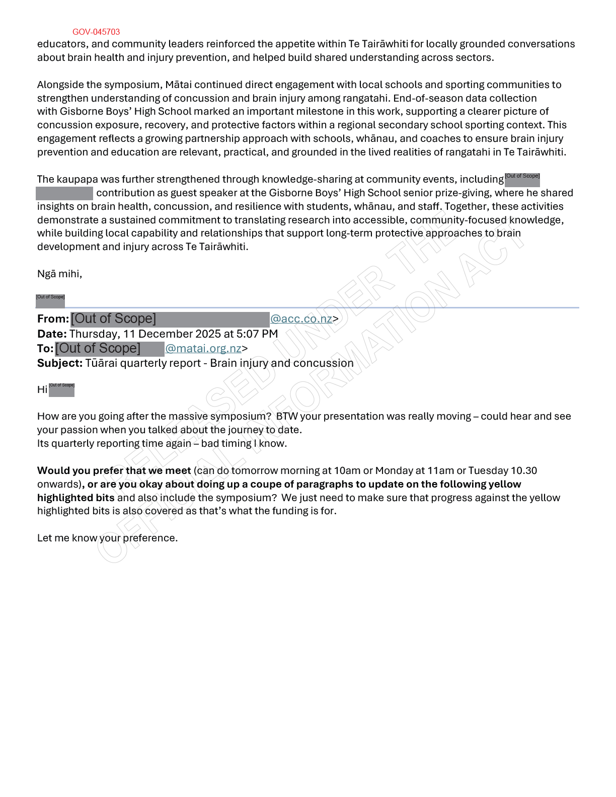 Subject: RE: Tūārai quarterly report - Brain injury and concussion