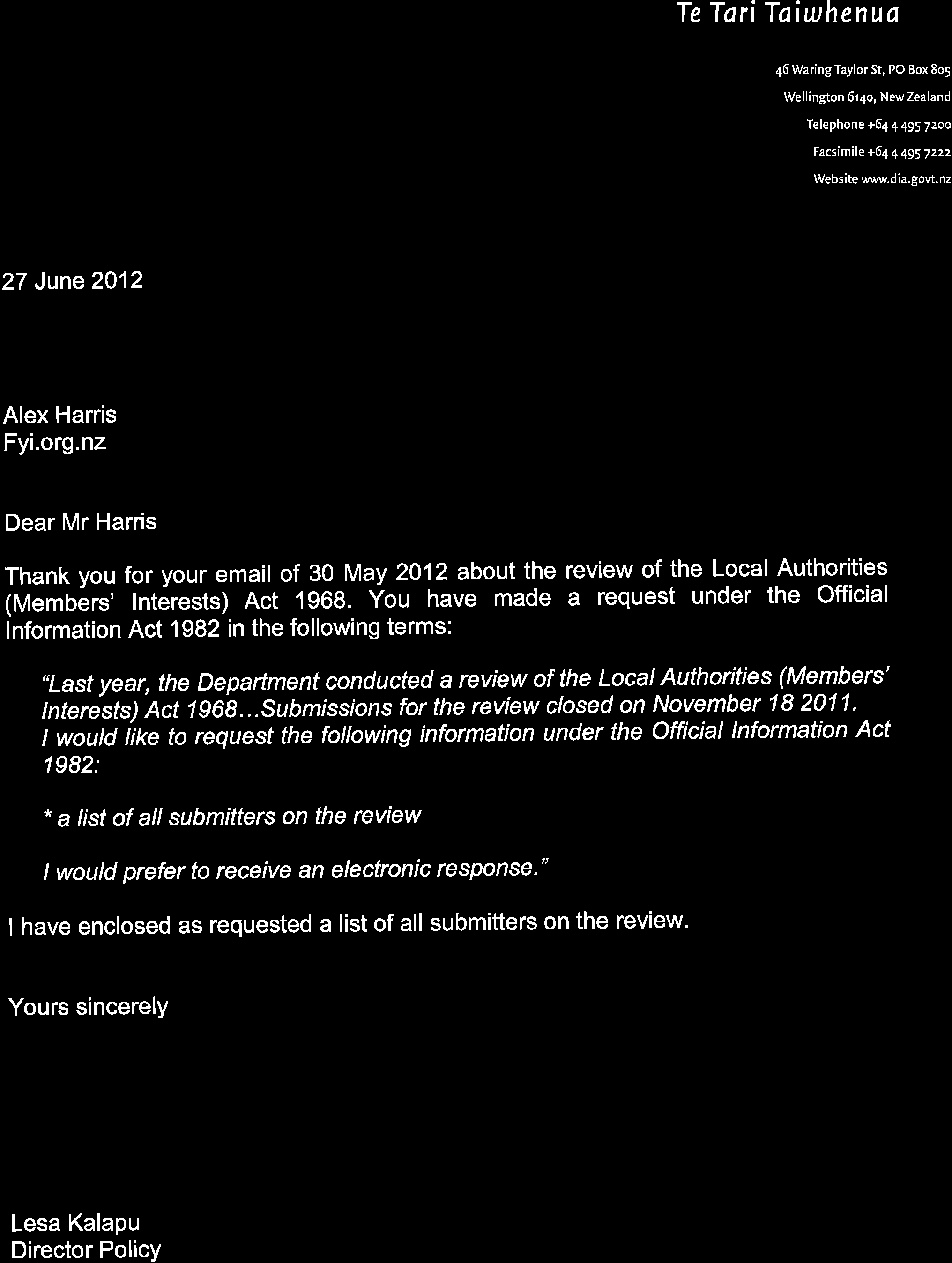 List of submitters on review of Managing Conflicting Interests in Local Government
