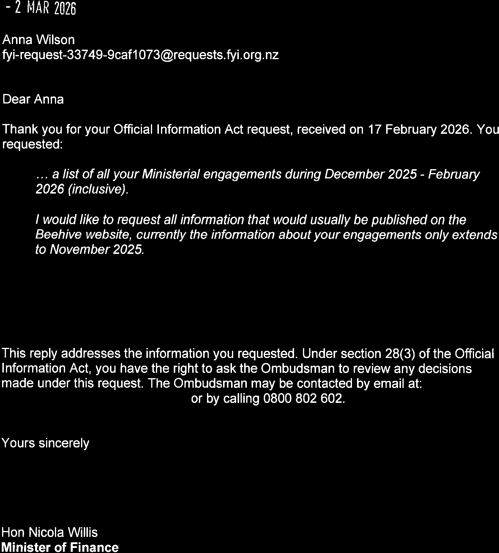 This is an HTML version of an attachment to the Official Information request 'Ministerial Engagements'.
