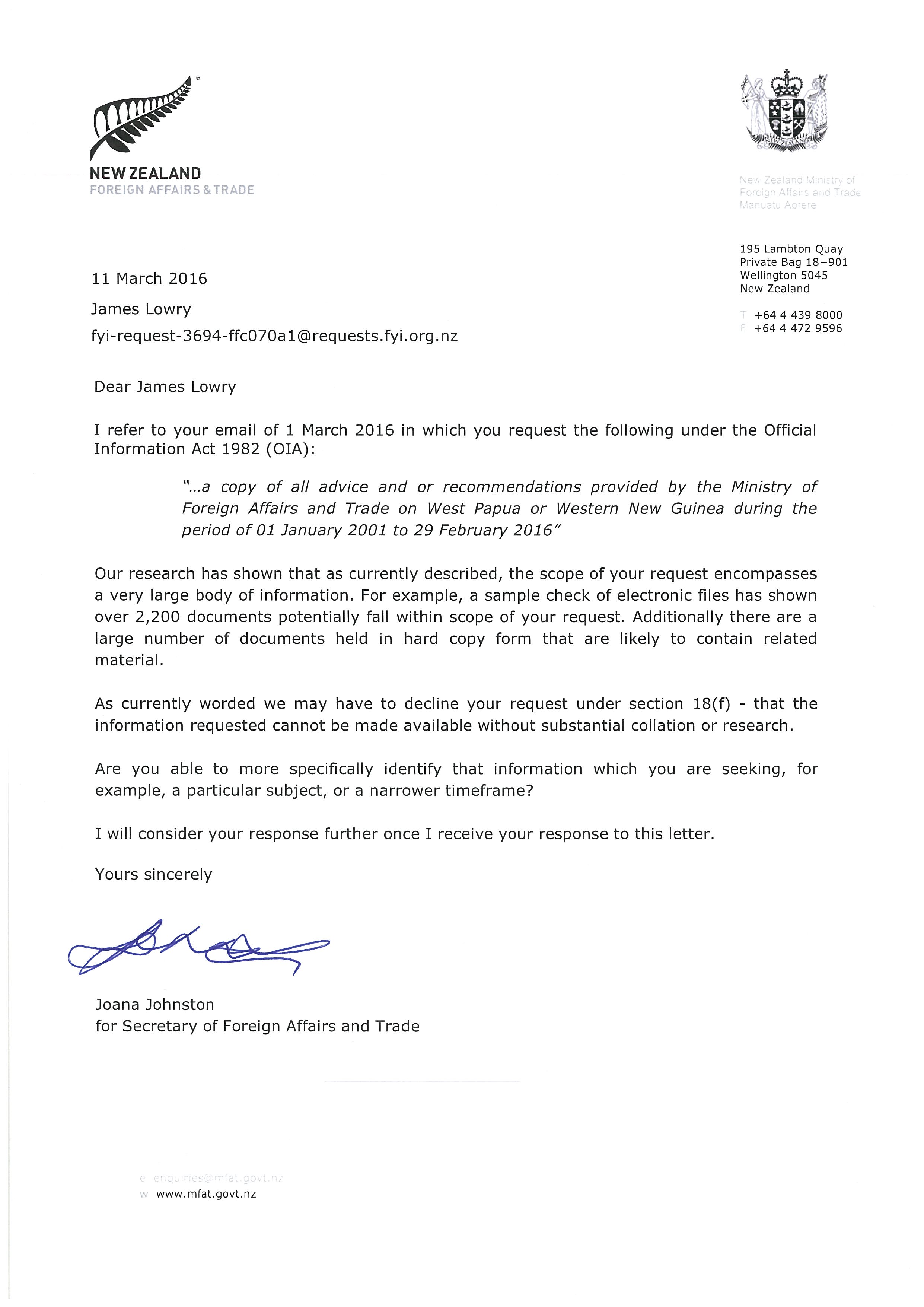 Advice and or recommendations provided by the Ministry of Foreign Affairs and Trade on West Papua or Western New Guinea