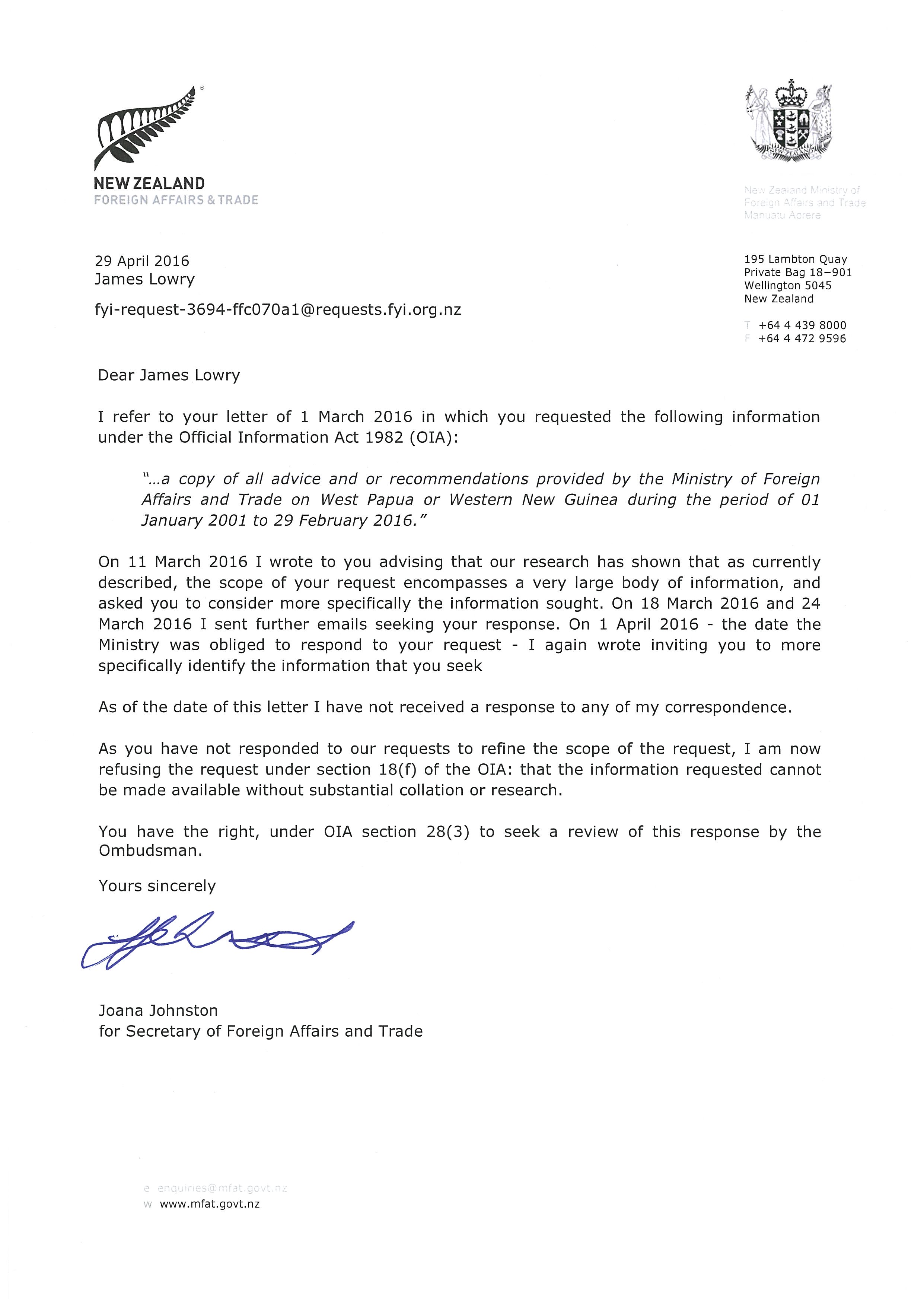 Advice and or recommendations provided by the Ministry of Foreign Affairs and Trade on West Papua or Western New Guinea