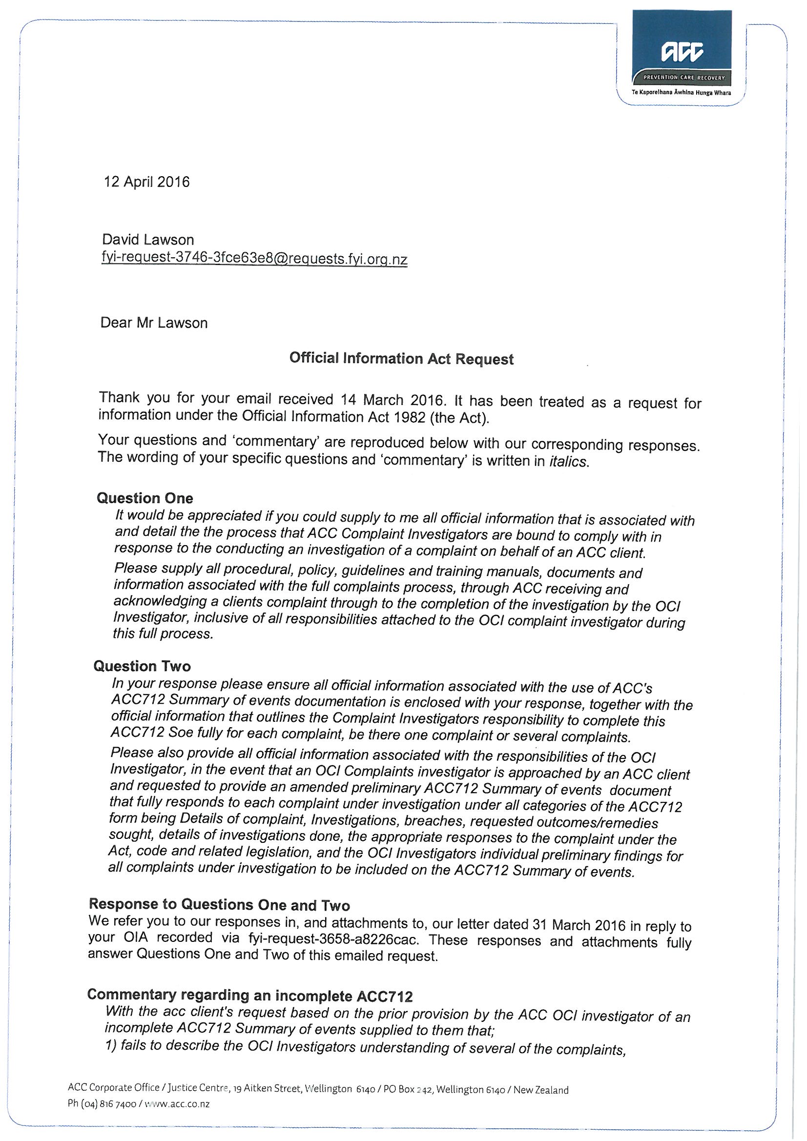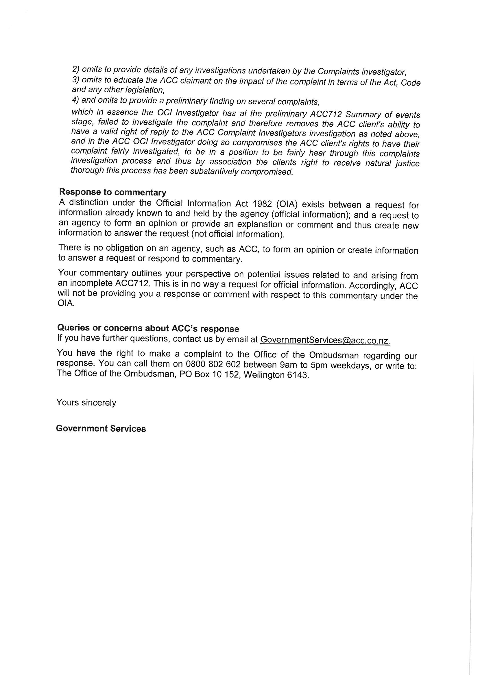 Office of the Complaints Investigation ACC use of the ACC712 preliminary Summary of Events form.
