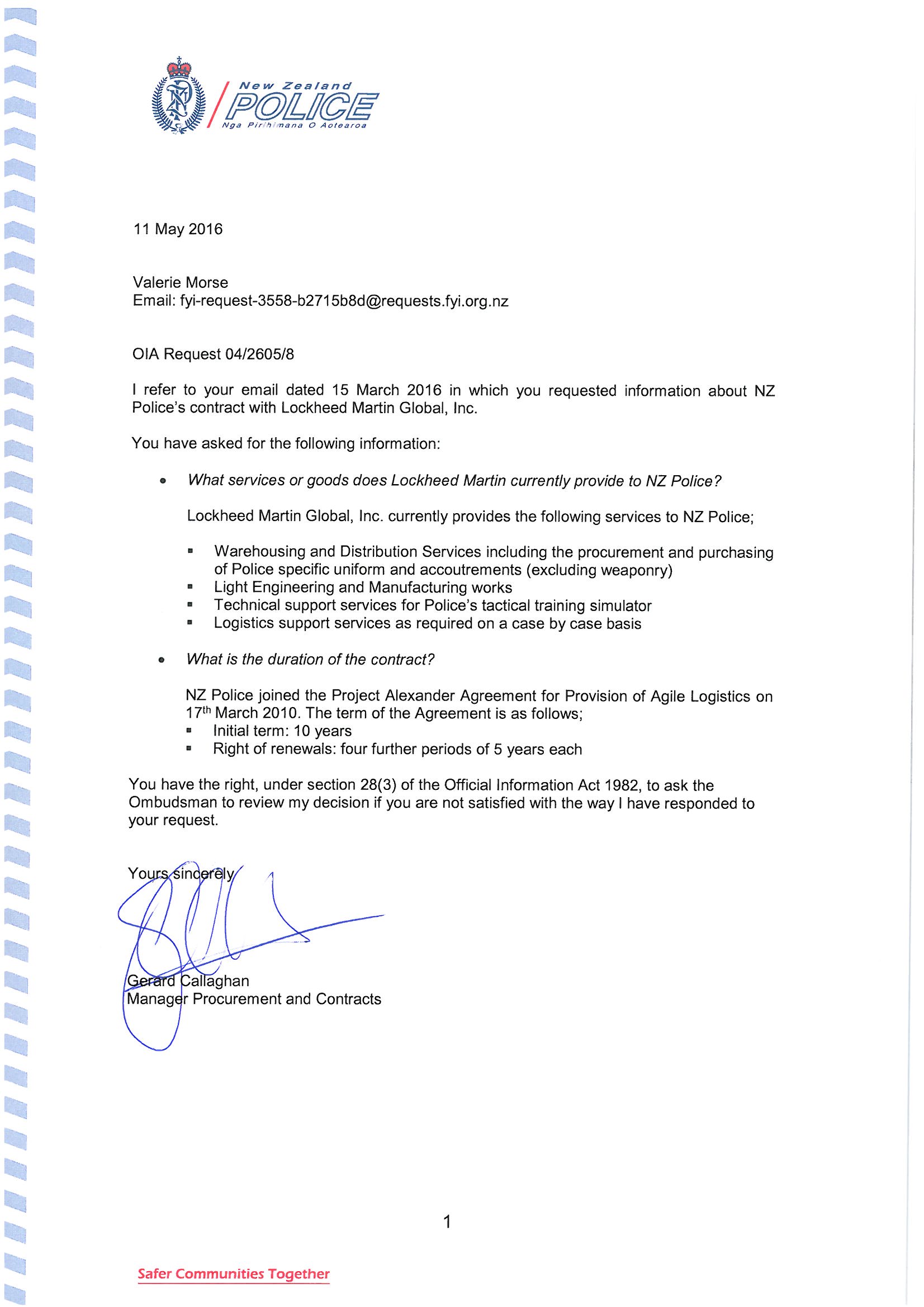 Lockheed Martin provision of services to Police