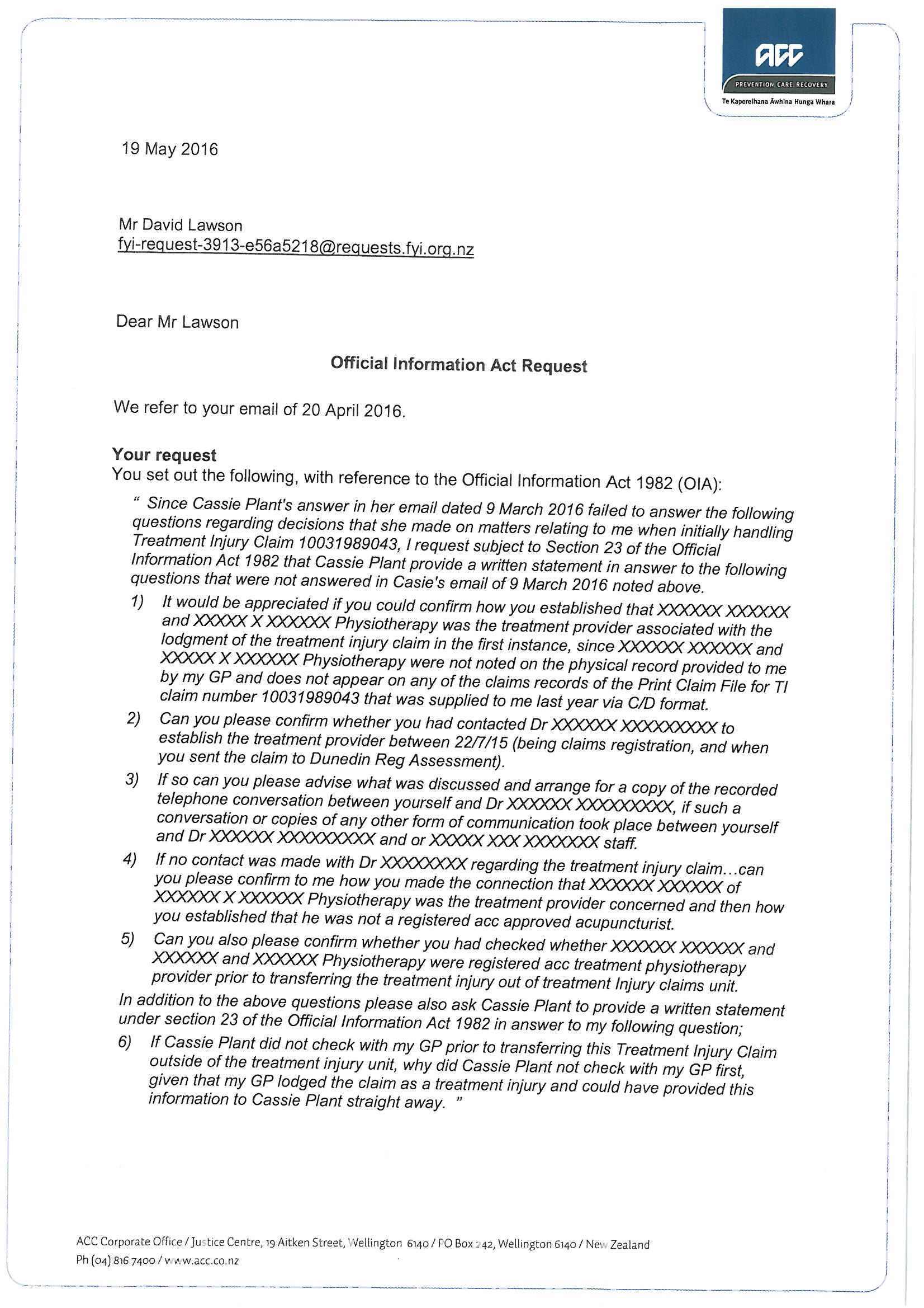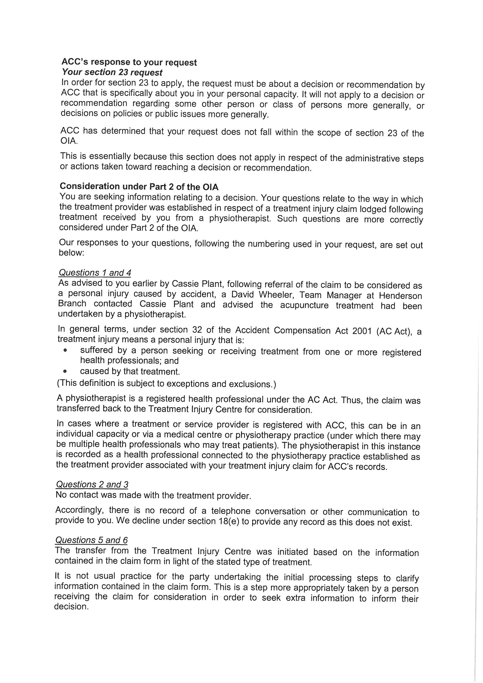 Request for written Statement from Cassie Plant at ACC under section 23 of the OIA 1982