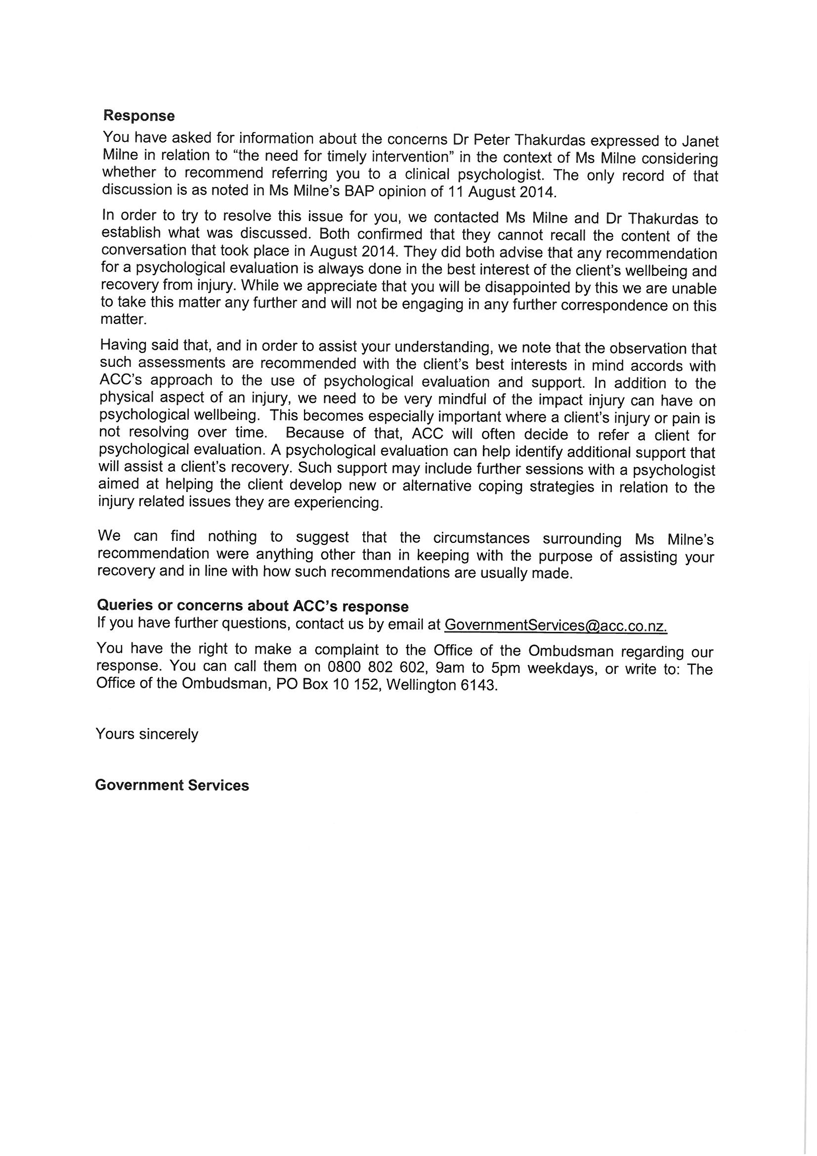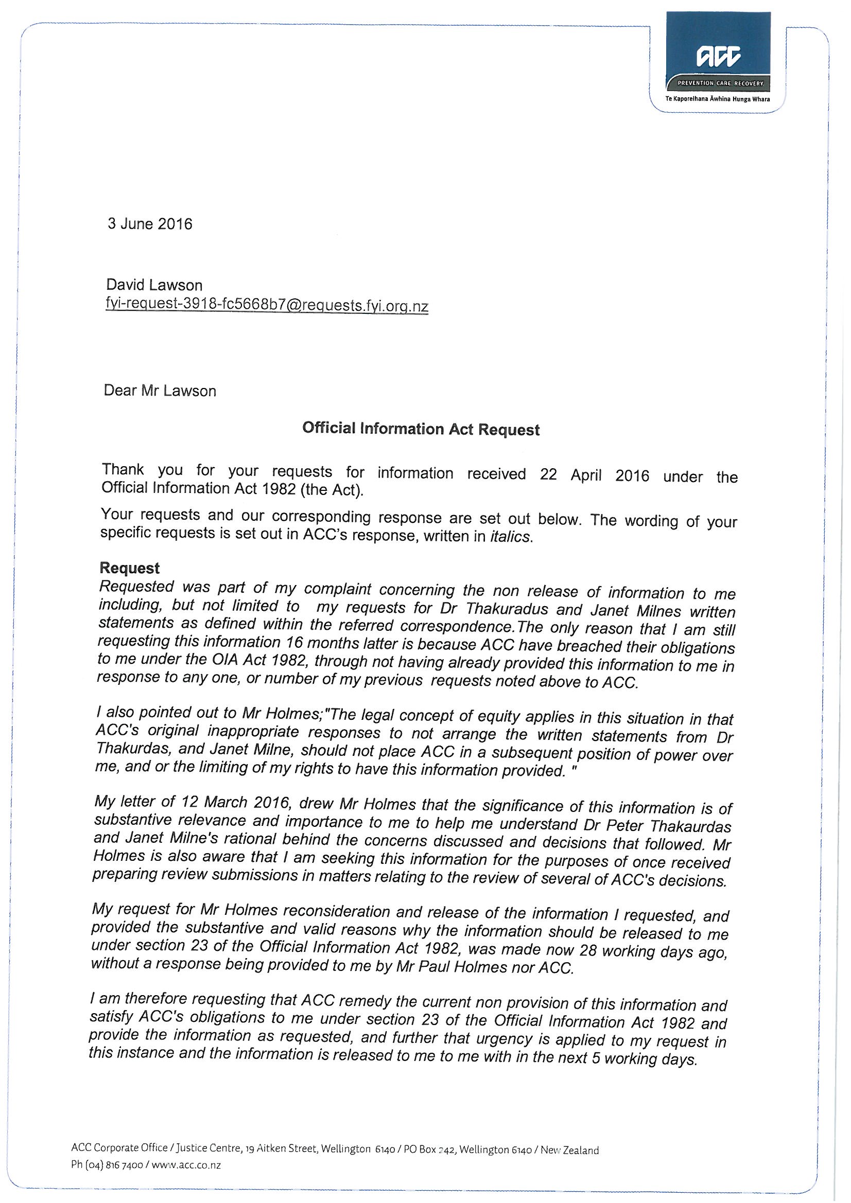 Follow up request for Official Information Request dated 12 March 2016 requested from ACC's Head of Privacy Mr Paul Holmes/ACC