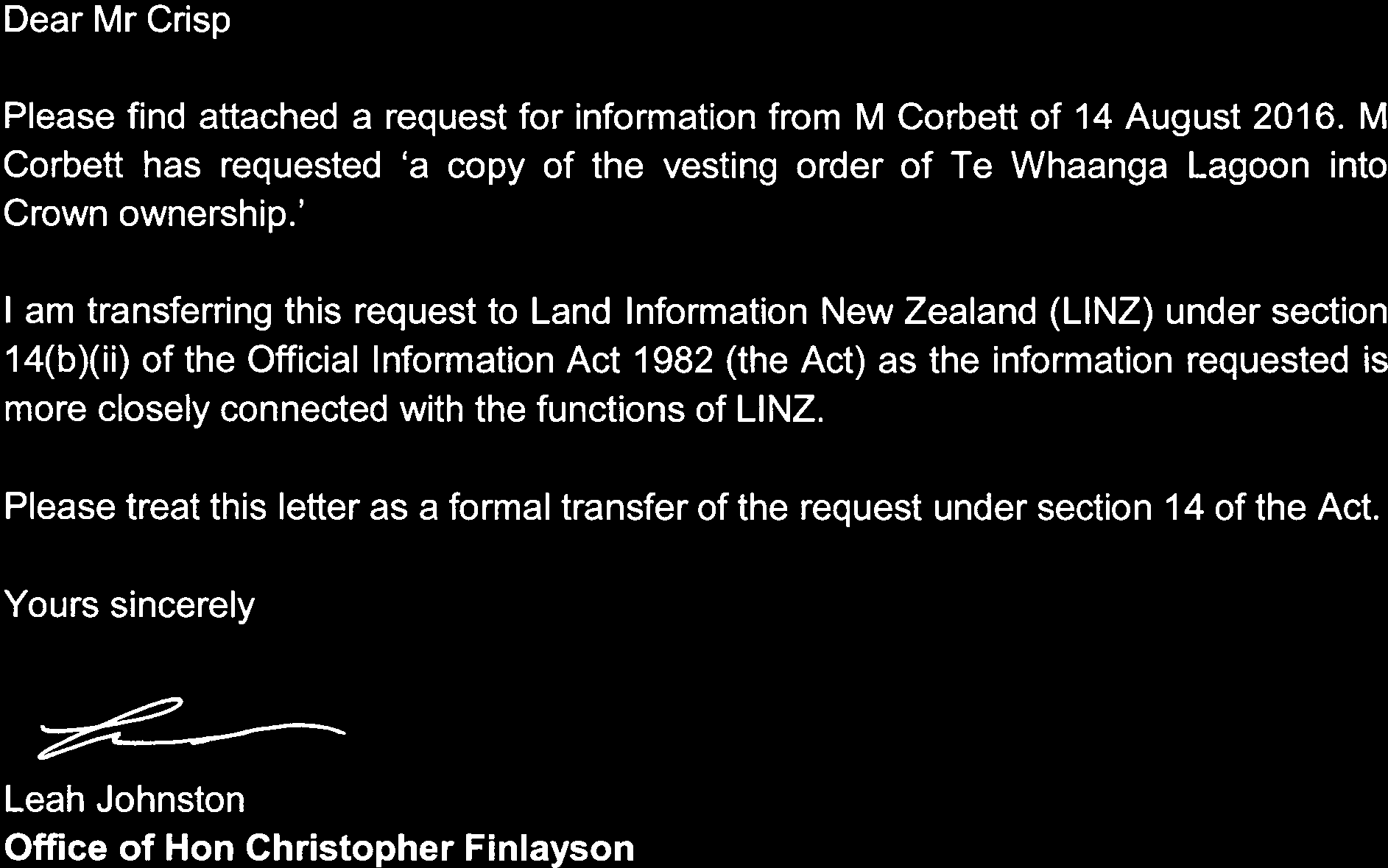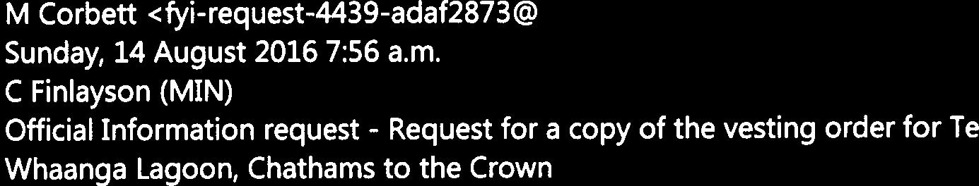 Request for a copy of the vesting order for Te Whaanga Lagoon, Chathams to the Crown