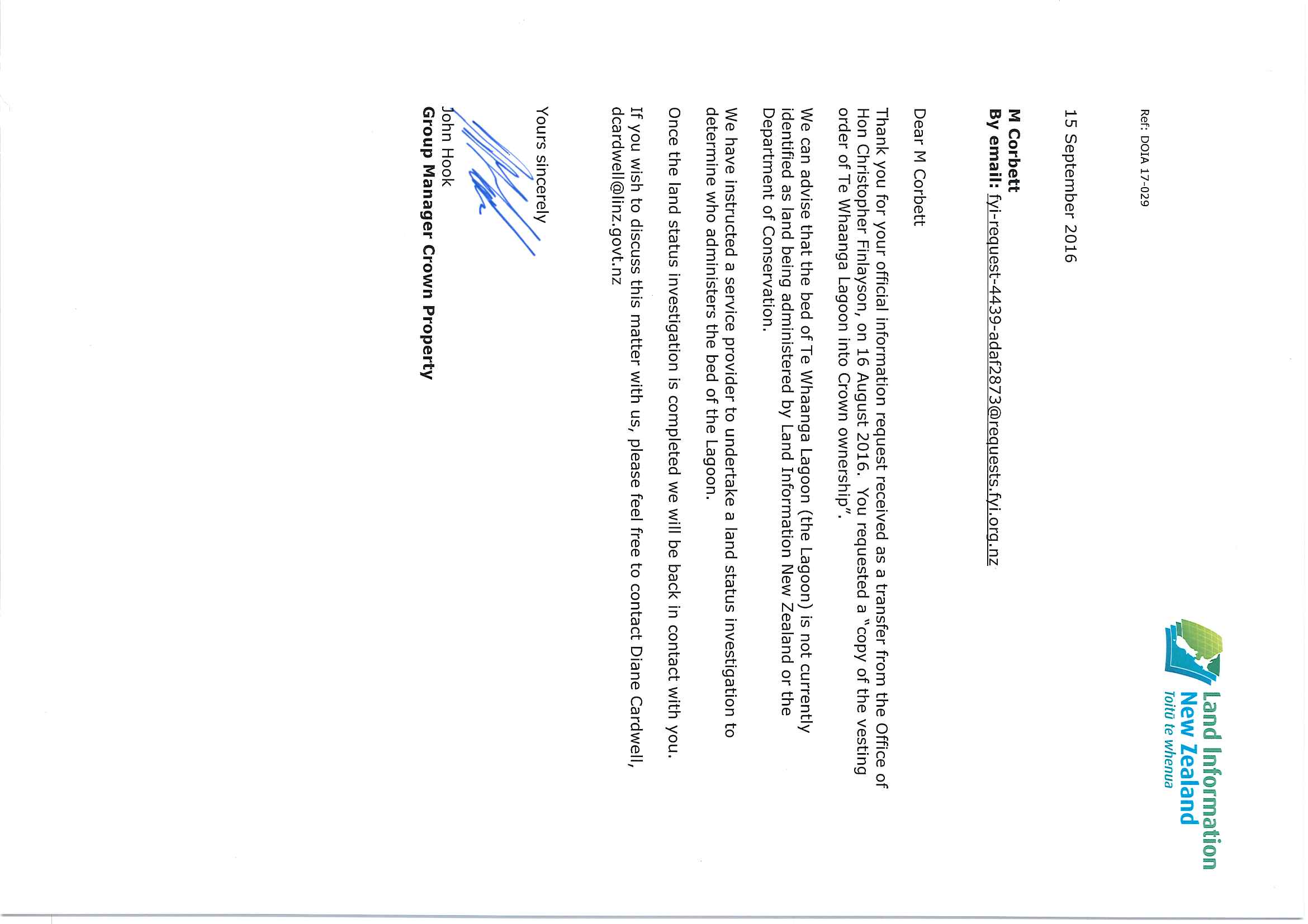 Request for a copy of the vesting order for Te Whaanga Lagoon, Chathams to the Crown
