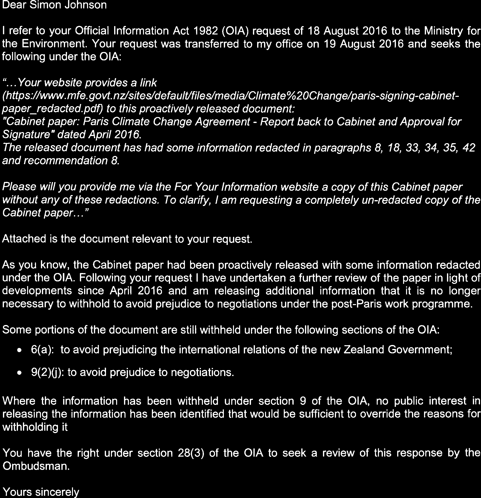 Cabinet paper: Paris Climate Change Agreement April 2016
