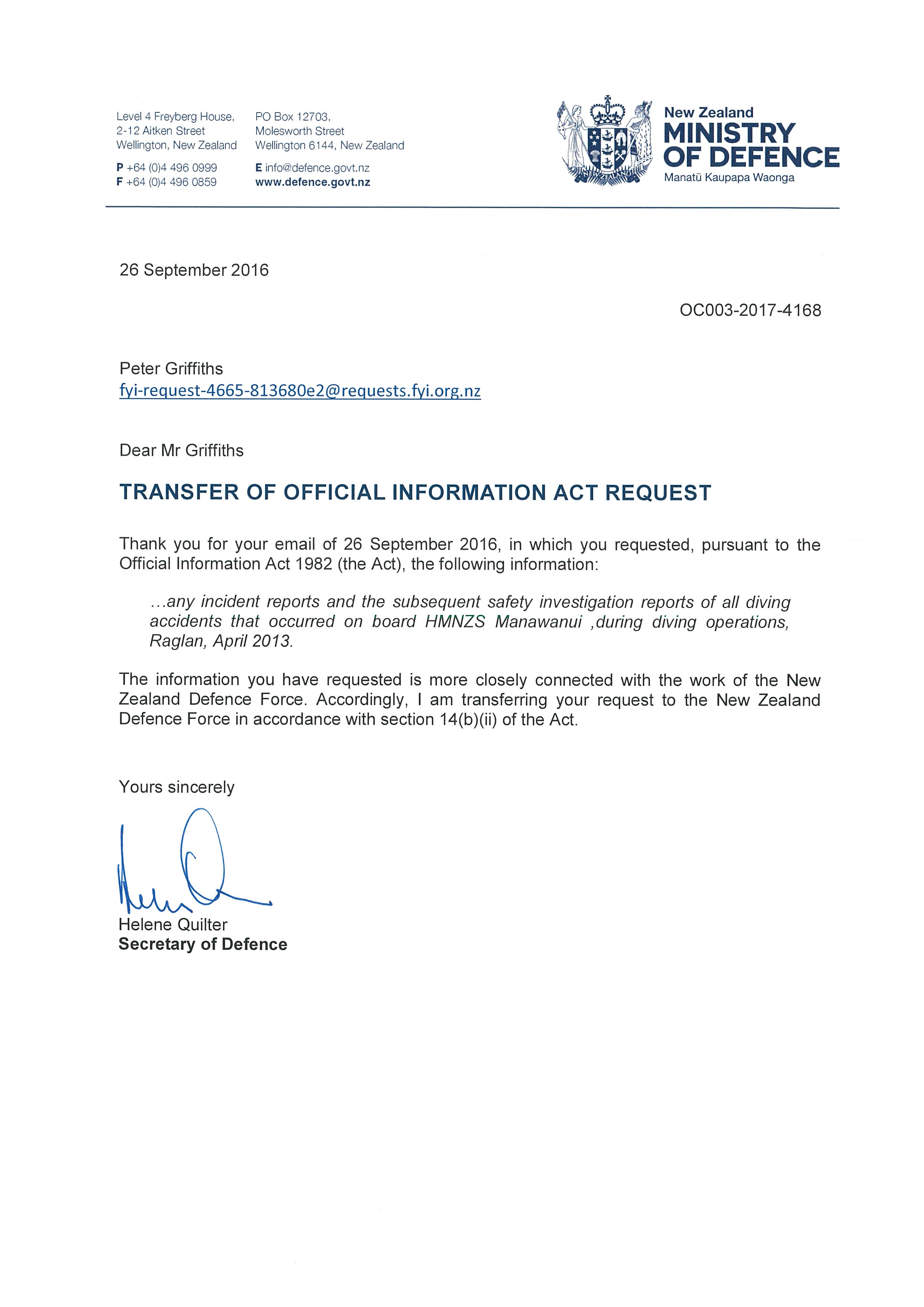 This is an HTML version of an attachment to the Official Information request 'Report of the safety investigation into diving accidents on board HMNZS Manawanui, April 2013 during operations on crashed aircraft'.