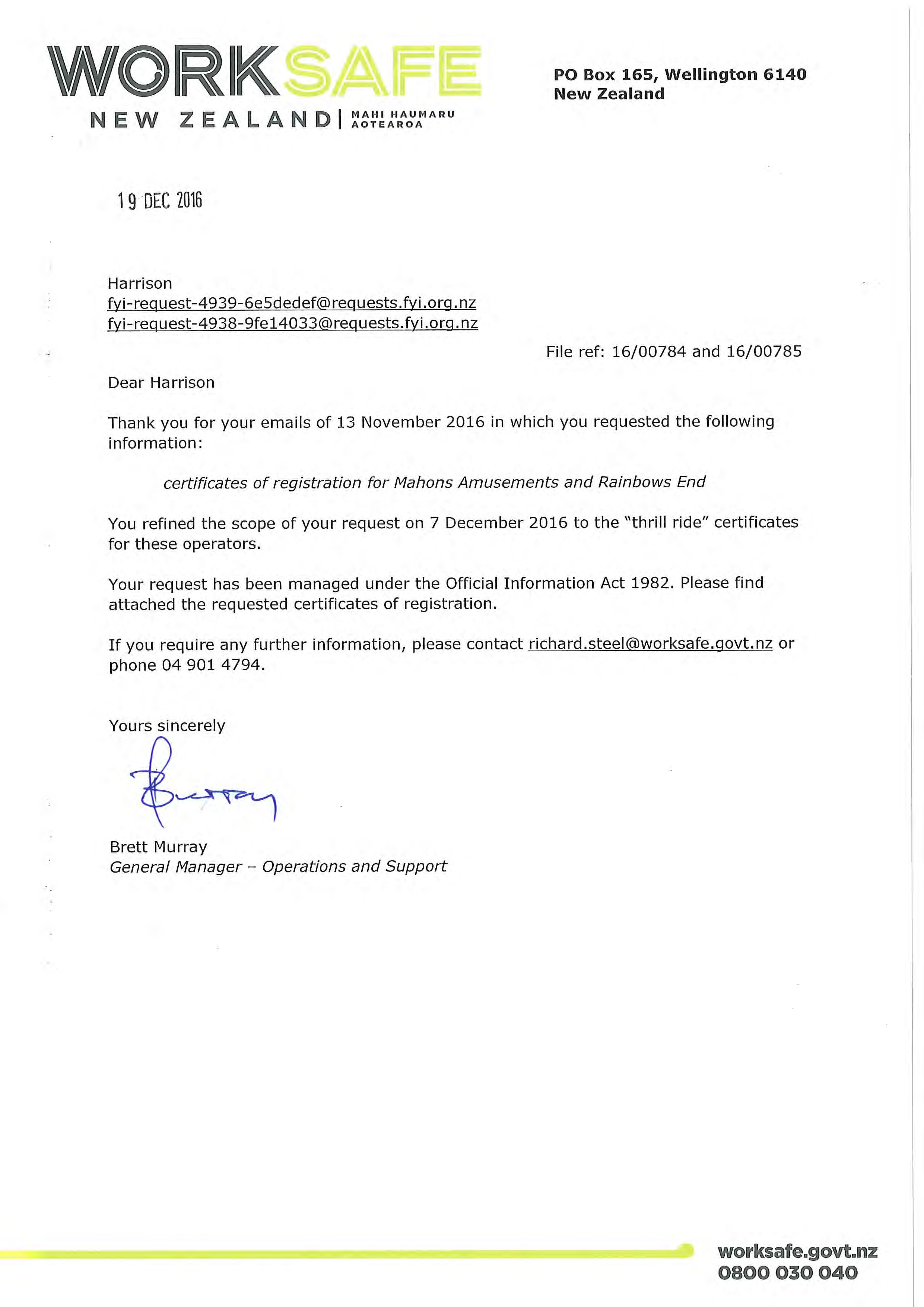Certificate of Examination for Amusement Devices at Rainbow's End