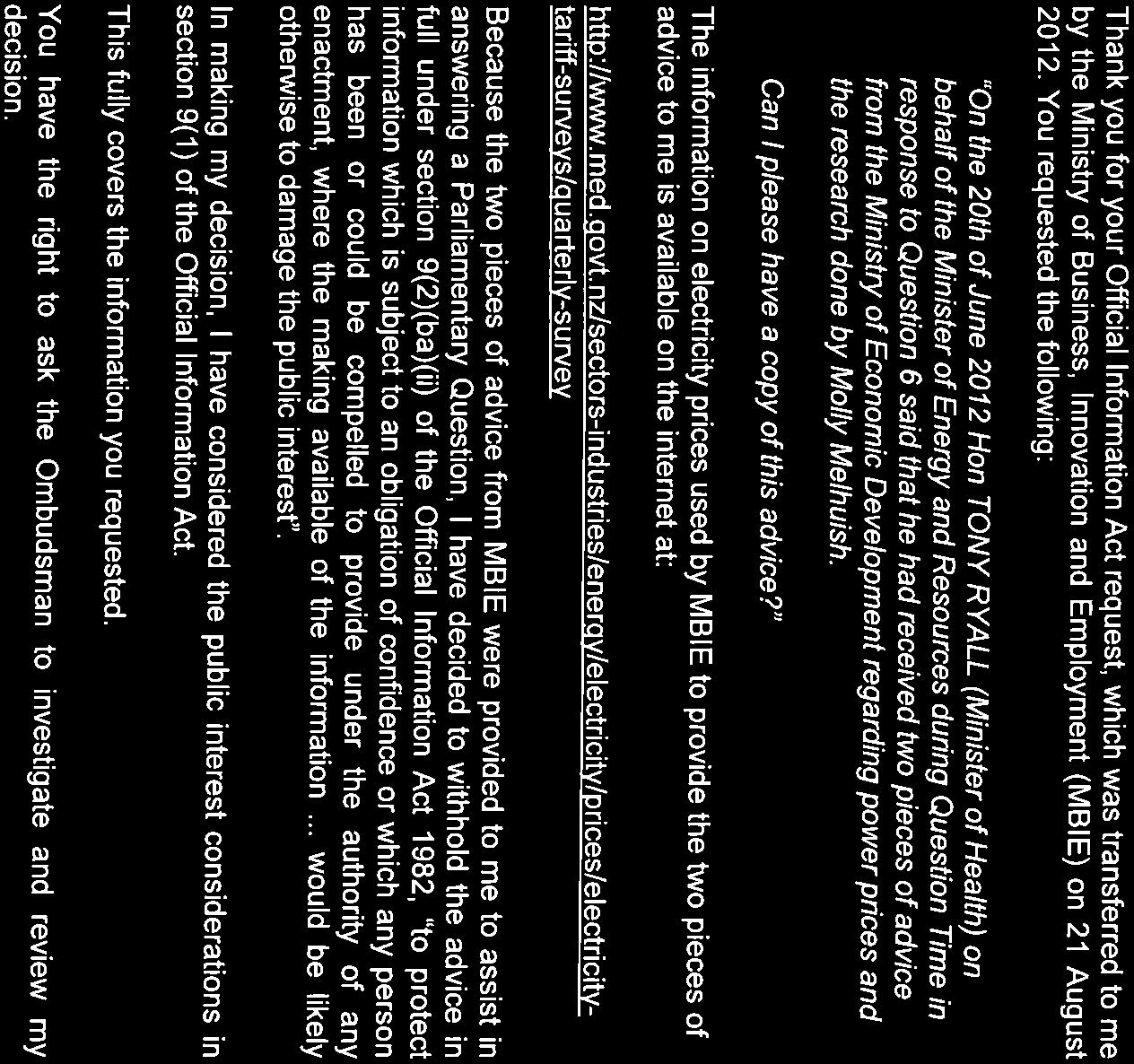MED advice to the minister regarding power prices