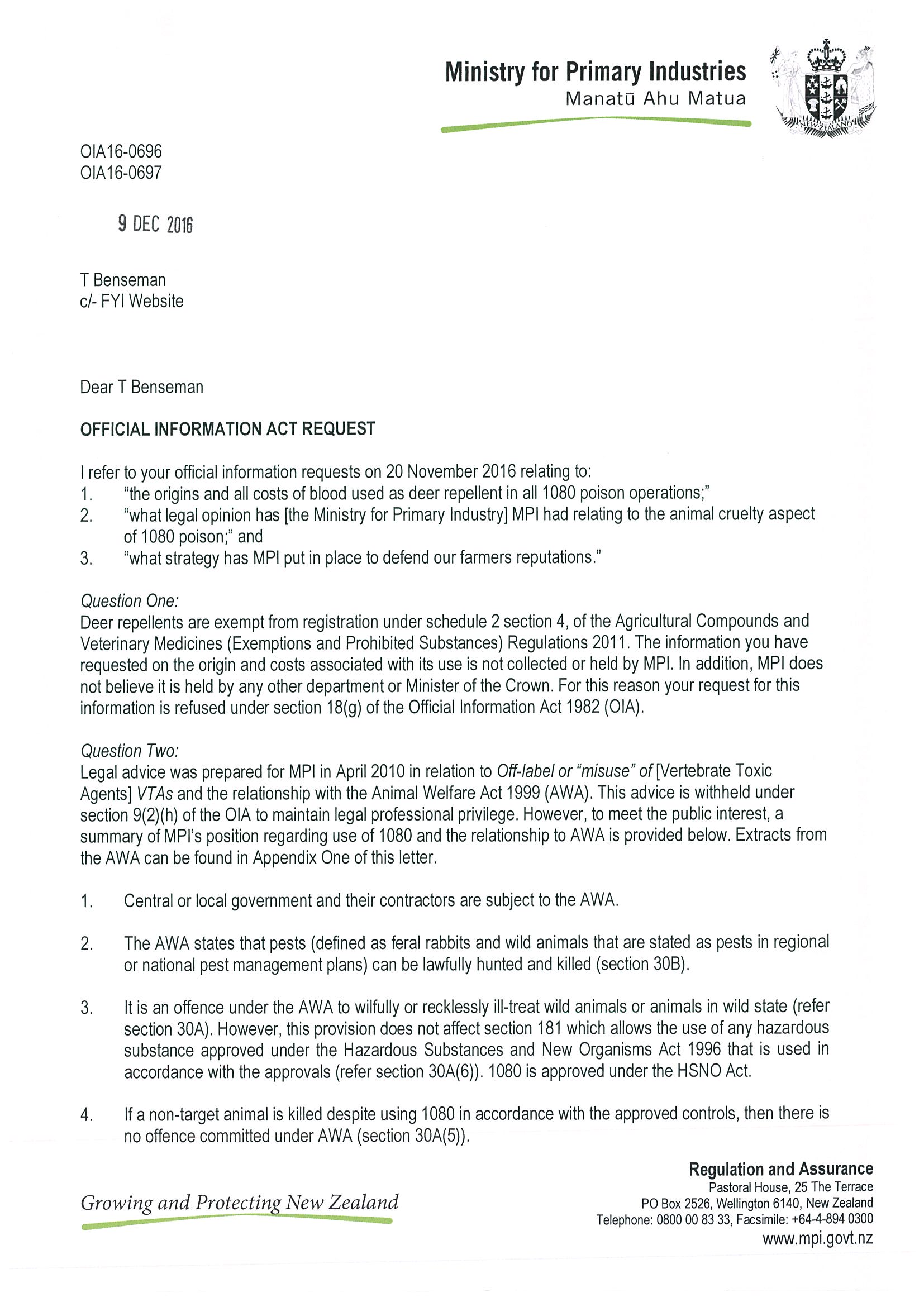 Origin and cost of blood used as deer repellant in 1080 poison operations