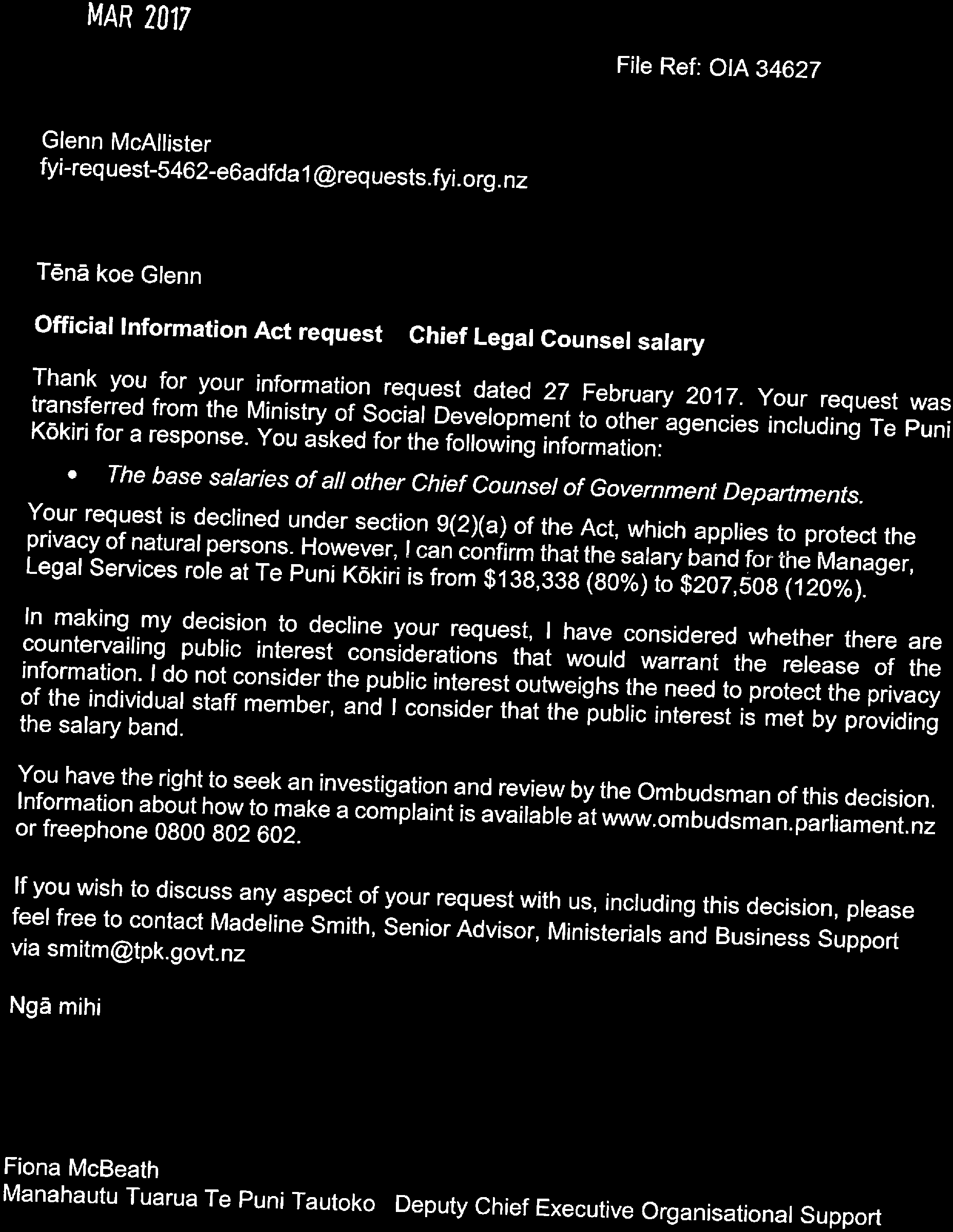 Annual salary of chief legal counsel for the Ministry of Social Development