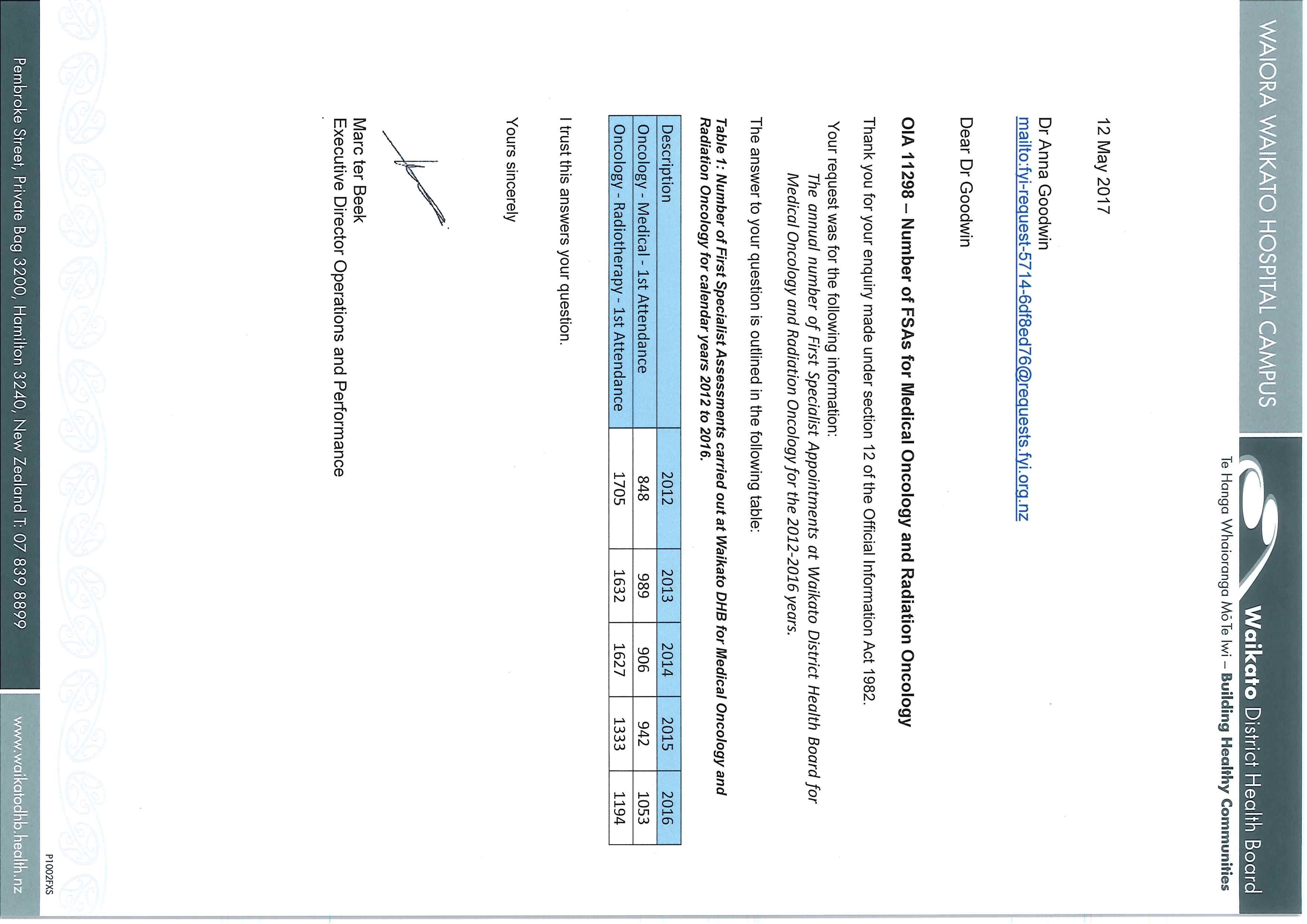 Annual First Specialist Appointments for Medical Oncology and Radiation Oncology inclusive for 2012-2016