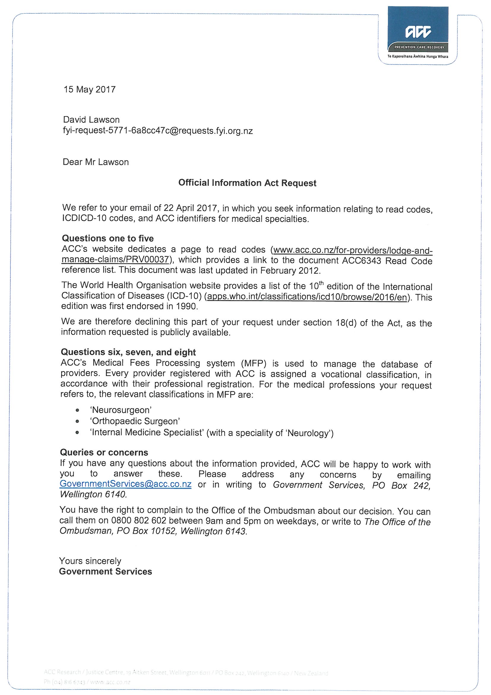 Request for full list of ACC recognised Read Codes and descriptions and International Classification of Diseases: 10 (ICDICD-10) codes and descriptions.